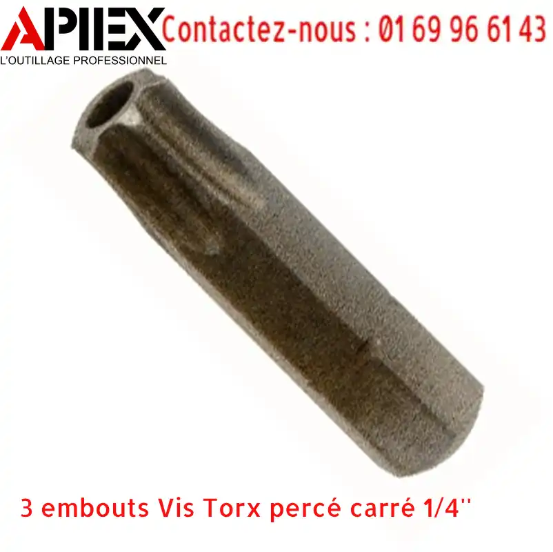 Lot de 3 Embouts carré 1/4 » pour vis Torx sécurité percé longueur 25 mm Produits disponibles : – Taille TT6 – Taille TT7– Taille TT8– Taille TT9– Taille TT10– Taille TT15– Taille TT20– Taille TT25– Taille TT27– Taille TT30– Taille TT40