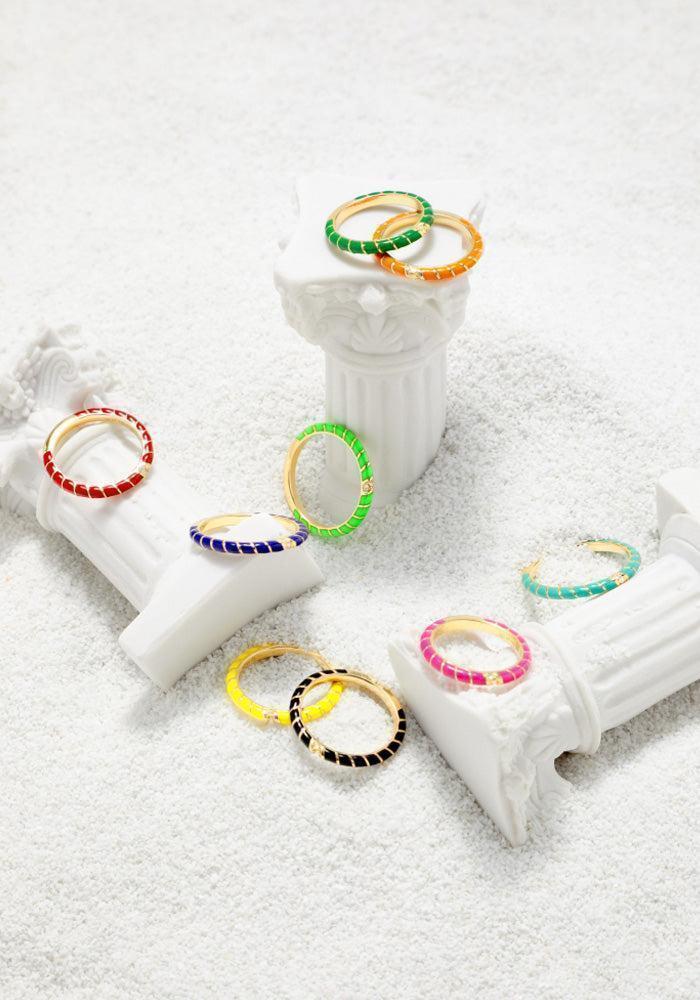 Cumuler cette bague avec d’autres bagues fines et la couleur flashy, parfait pour l’été!!