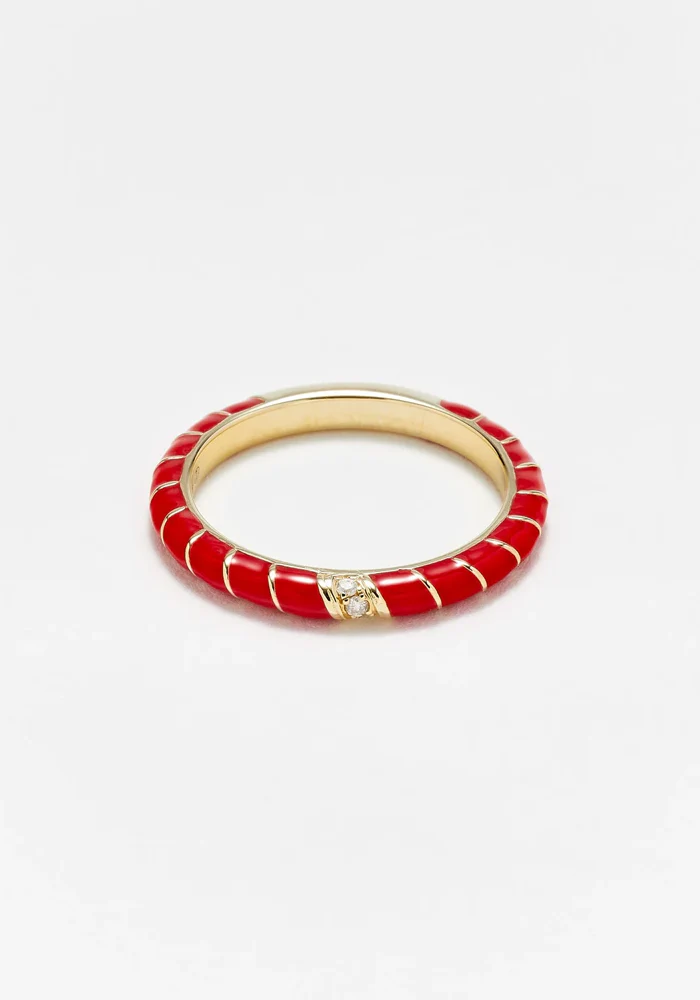 Bague alliance mini torsadée émail rouge et diamants gris montés sur or jaune 9 carats.