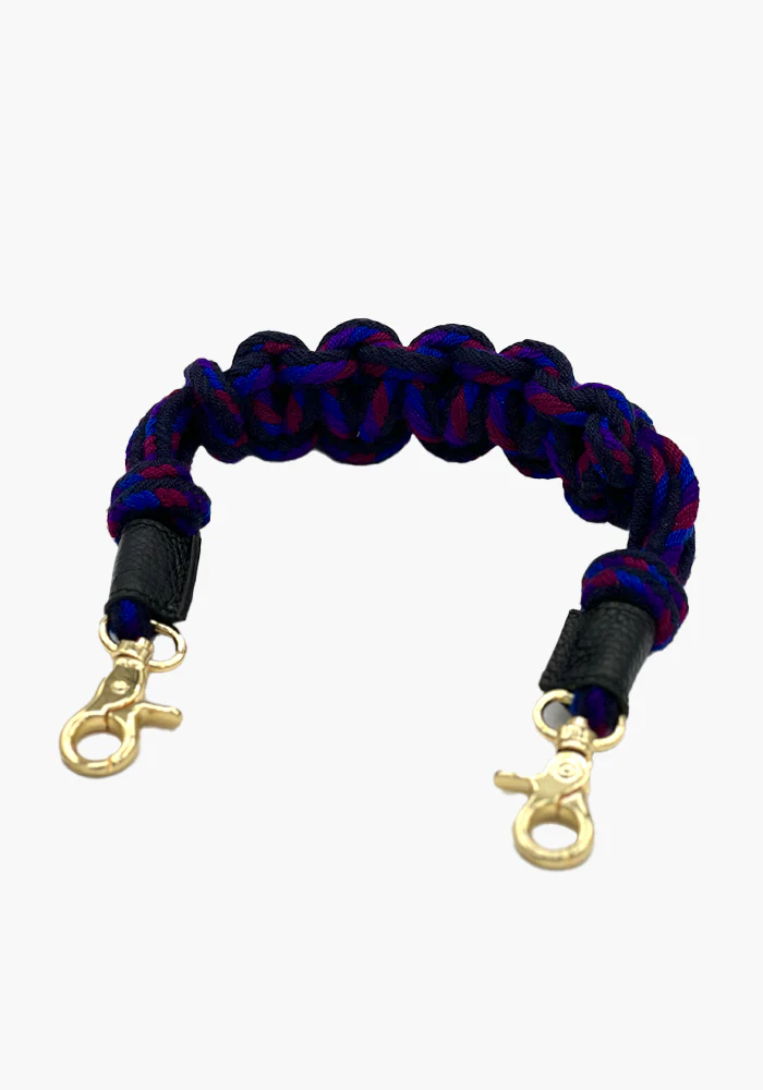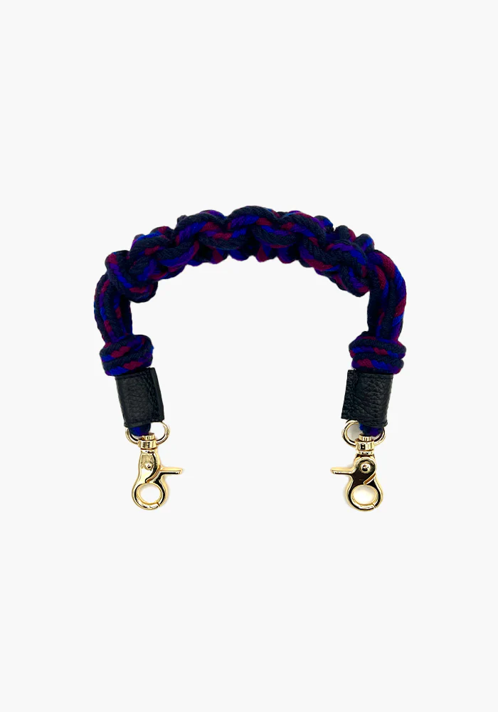 Anse de sac courte tissée et tressée avec les bouts en cuir et une bijouterie dorée. Caractéristiques : Composition : 90% acrylique 5% métal 5% cuir Longueur : environ 45 cm Bijouterie dorée Fait à la main, en Espagne