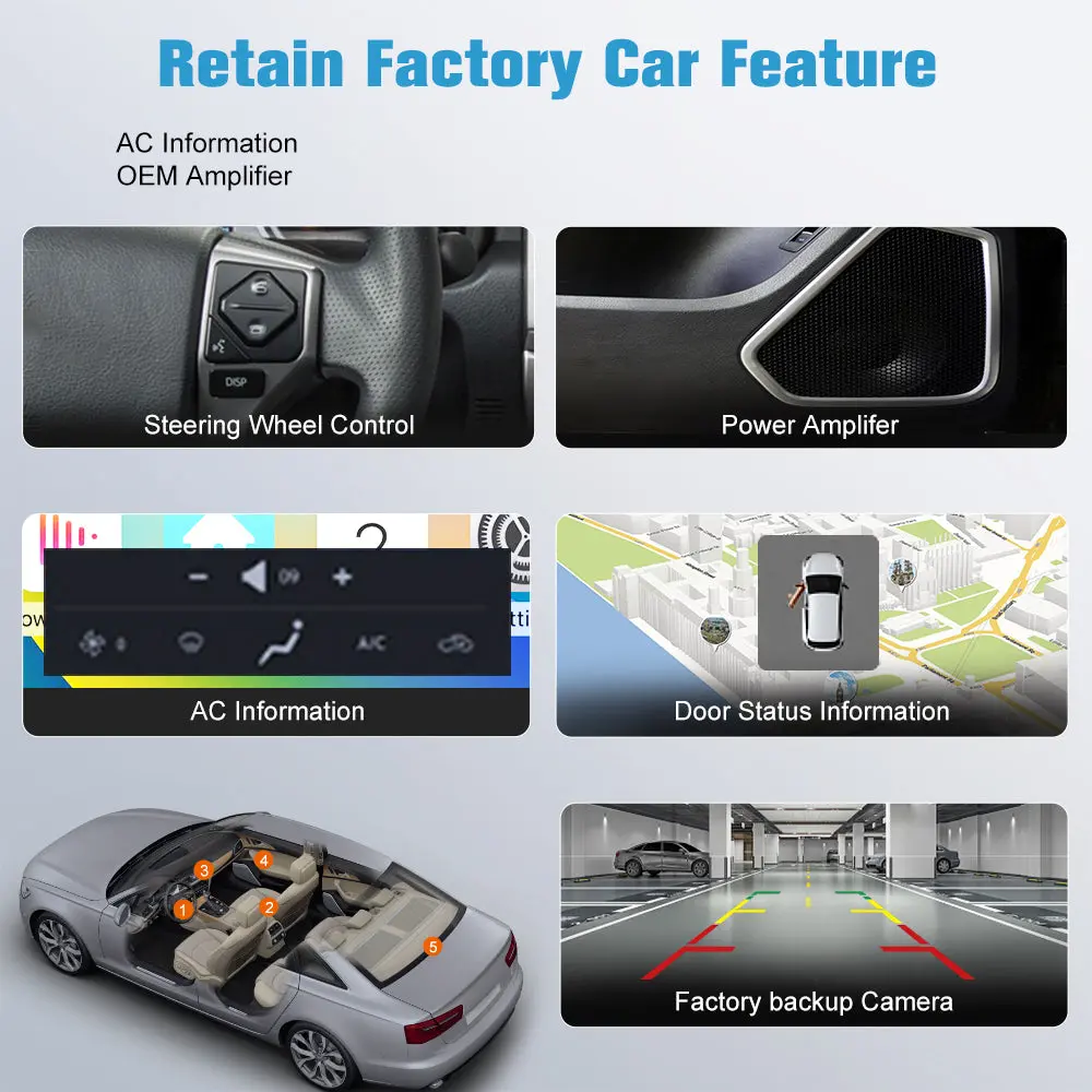 - 【Retain Original Factory Functions】The car radio retains original functions, including the AC information,amplifier function, factory steering wheel control, factory reversing camera, etc.