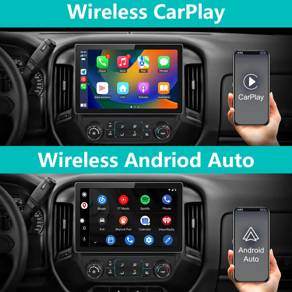 - 【Wireless Carplay & Android Auto】You can choose wired connection or wireless connection to Carplay or Android Auto.By connecting your iPhone or Android phones,you can access mobile phone address book,notifaction,message,map navigation,music and so on.