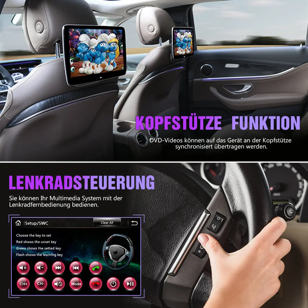 • Weitere praktische Funktionen: wie CD-/DVD-Laufwerk, Spiegelung von Android-Smartphones, Anschlussmöglichkeit für Kopfstützen-Player, 7 einstellbare Beleuchtungsfarben, Rückfahrkamera-Anschluss (separat erhältlich), DAB+ (separat erhältlich). Diese Funktionen machen die Nutzung noch bequemer und vielfältiger