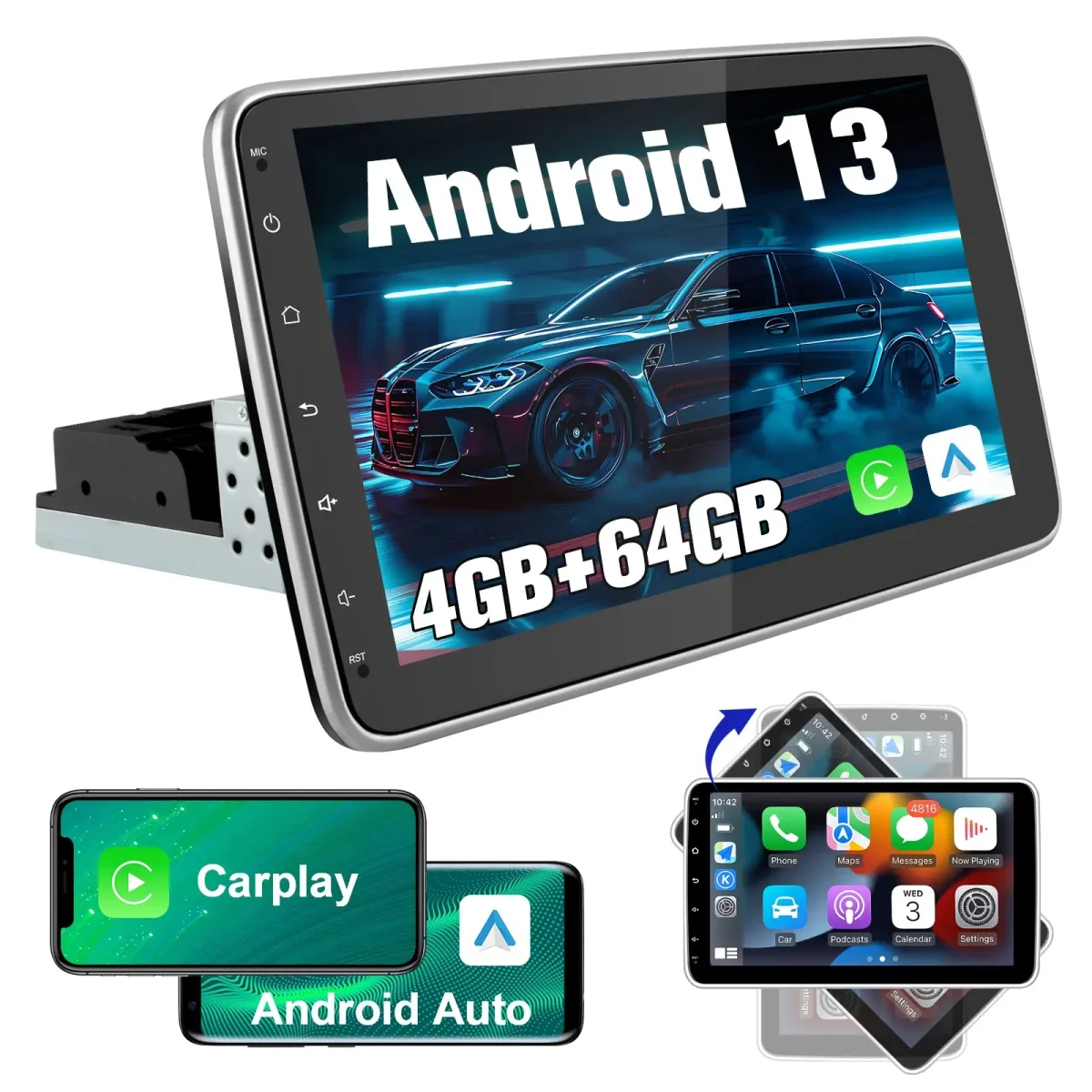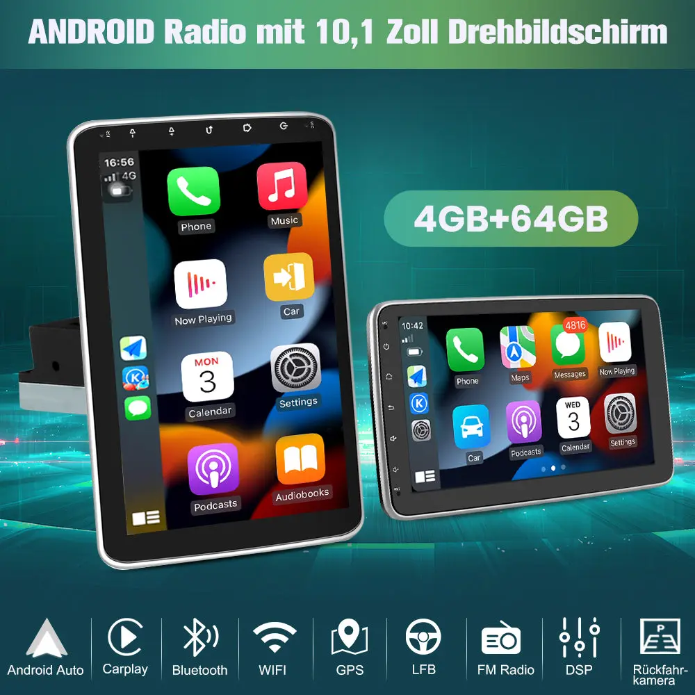 AWESAFE 2 DIN Autoradio mit Navi und Rückfahrkamer,Unterstützt DAB+,Android auto&Apple Carplay,10.1 Zoll Android 13 Radio mit 90° drehbarer Bildschirm