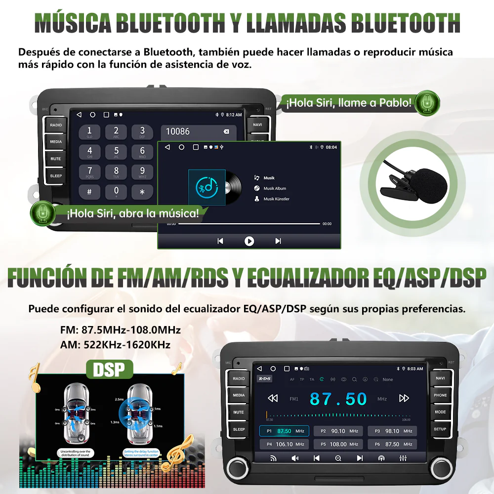 - 🏎️【FM/RDS/ASP DSP/EQ】Puede usar la función de emisoras no solo en España, sino que también puede escuchar radio FM/RDS incluso cuando viaje a otros países. Además de escuchar programas de radio, también puede configurar el ecualizador EQ y ASP/DSP, en la interfaz ASP hay 9 efectos de sonido para elegir: jazz, ciudad, pop, clásico, etc. EQ: el usuario puede ajustar el volumen de 4 maneras: frontal izquierdo, delantero derecho,modo trasero y vehículo completo.