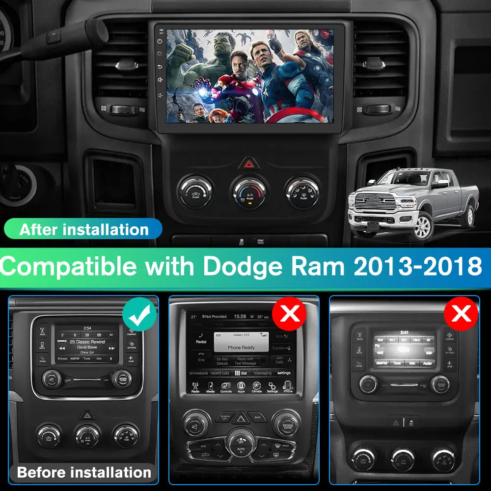 - 🚘【Applicable Car Models】This car stereo is retain Original Factory frame. Compatible with Dodge Ram 1500 2500 3500 2013/2014/2015/2016/2017/2018 2019 Manual AC. Please check the year, dimensions, and shape of the center console of your vehicles before purchasing.