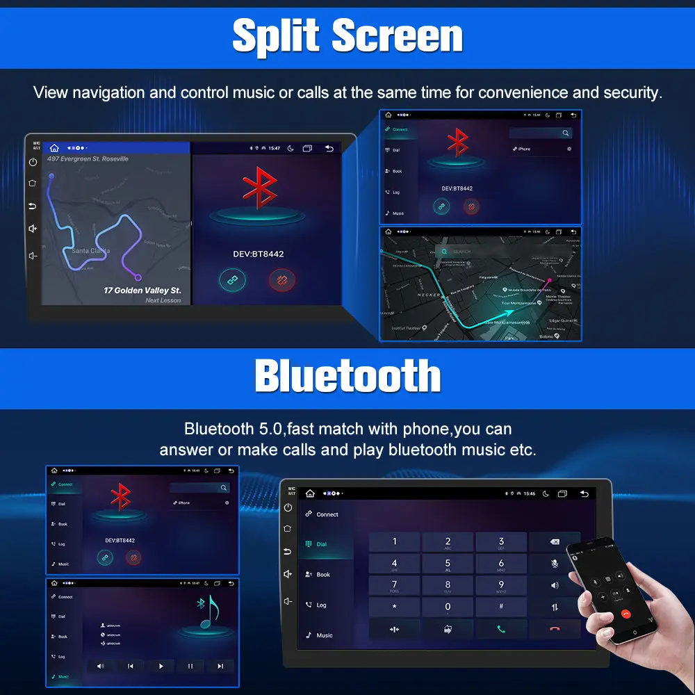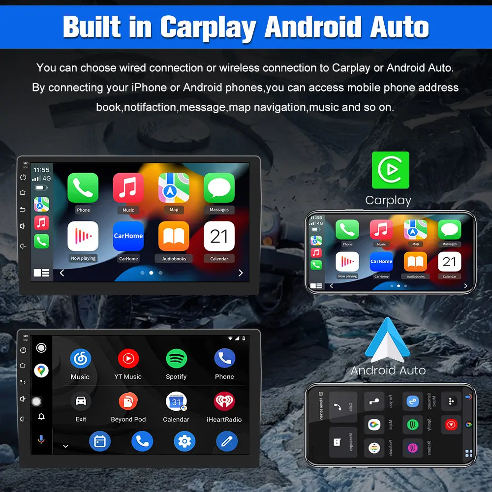 - 【Wireless CarPlay & Android Auto】Smart way to use your phone in the car:Simply connect your iPhone/Android phone to the Android car radio via Bluetooth. Using the smart voice assistant or touch display, you can get directions, make calls, send and receive messages, and enjoy music and more.