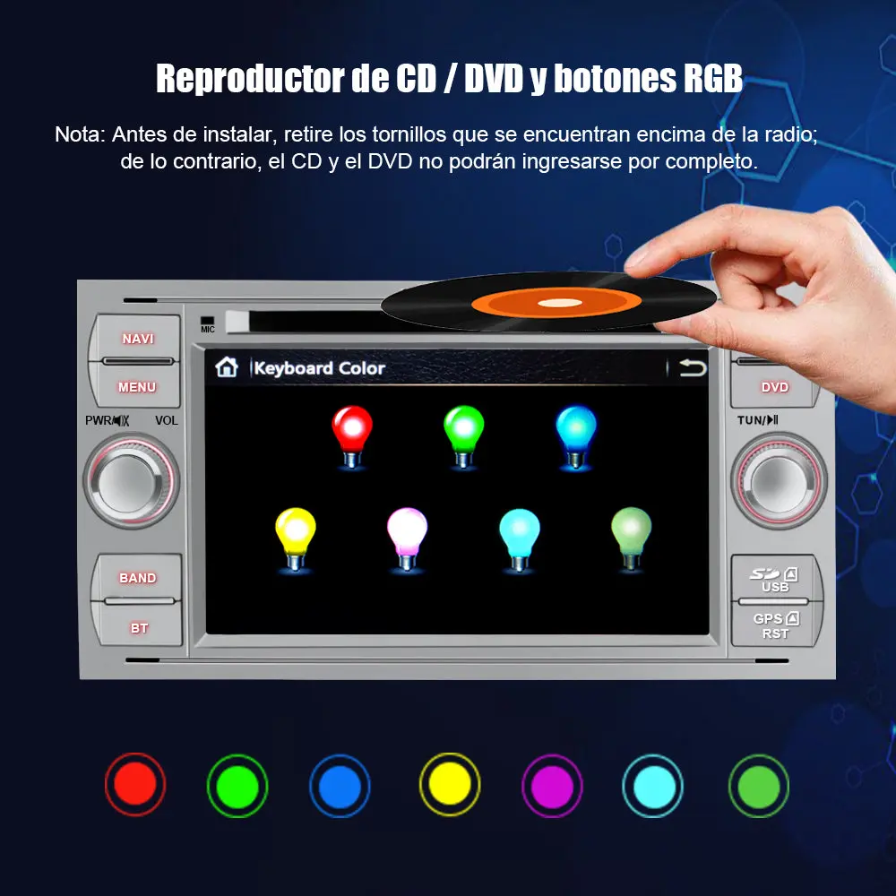 - 🚕【Otras características de la radio】1. Puede cambia automáticamente o manualmente el brillo de la pantalla durante el día y la noche; 2. Logotipo de coche personalizado; 3. Función RGB, los botones se pueden seleccionar para alternar entre siete colores o para fijar un solo color; 4. Puede transferir el vídeo al reposacabezas con AV OUTPUT; 5. Duplicar la pantalla de su Android Smartphone (No sirve para iPhone).