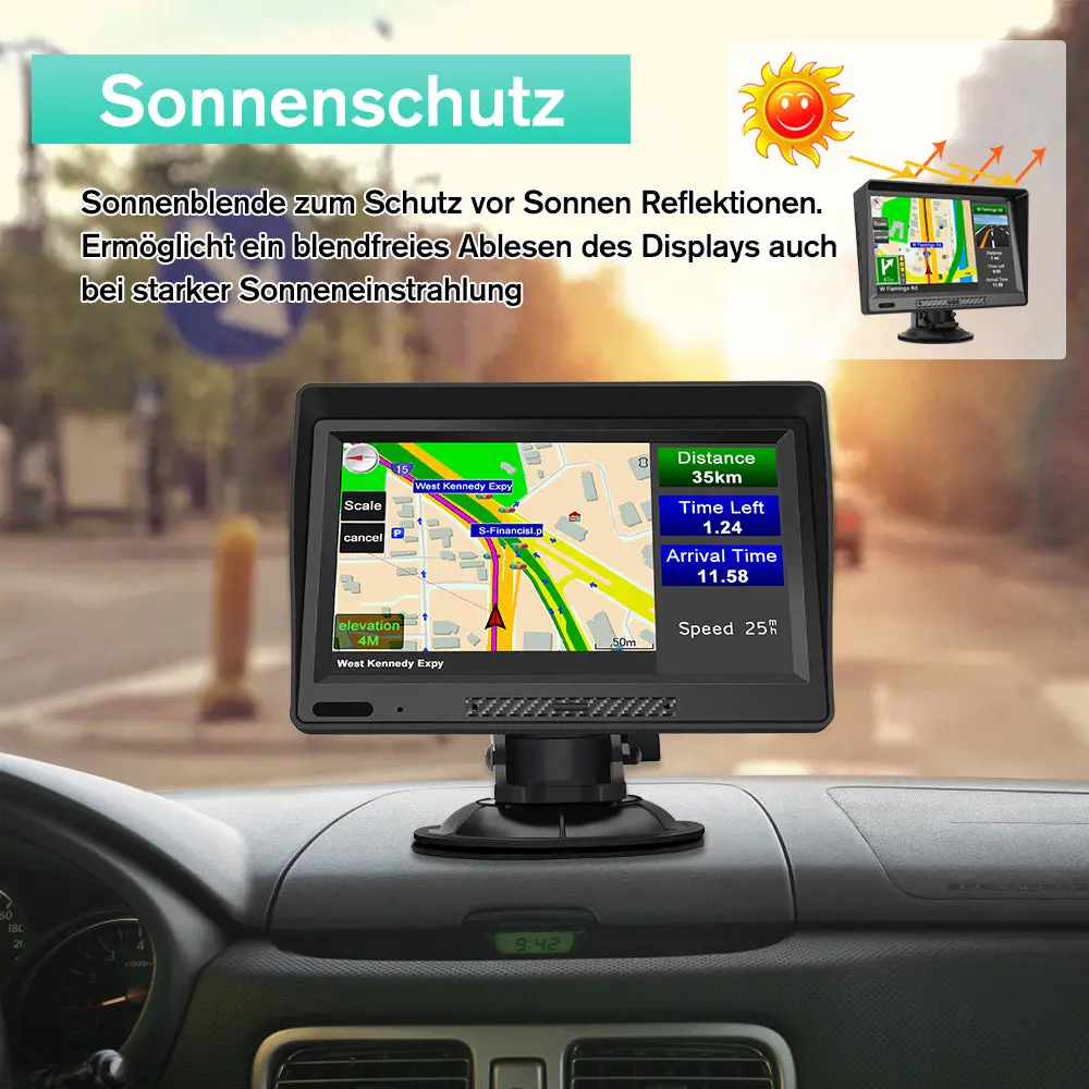 【9 Zoll Touchscreen, Sonnenblende Design】Das Navi ist mit befestigter Sonnenblende ausgerüstet, macht das Betrachten Ihr Navi Bildschirm leichter bei hellem Sonnenlicht, mit einem hochwertigem LCD-Display ausgestattet, auf dem die Karten mit einer Auflösung von 800 x 480 Pixeln angezeigt werden.