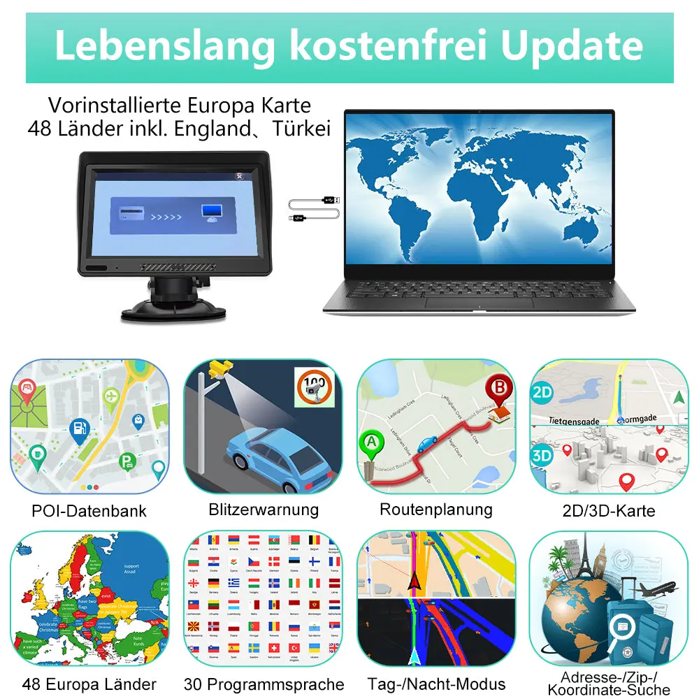 【Lebenslang kostenlos Karten-Updates】Kartenabdeckung für 48 europäische Länder enthalten Türkei. Genießen Sie hochwertige Offline-Karten – überall und jederzeit. Die Offline-Karten werden für die GPS Navigation ohne Internetverbindung auf der Navi gespeichert. Mit der Navi haben Sie immer die akutellsten Karten.