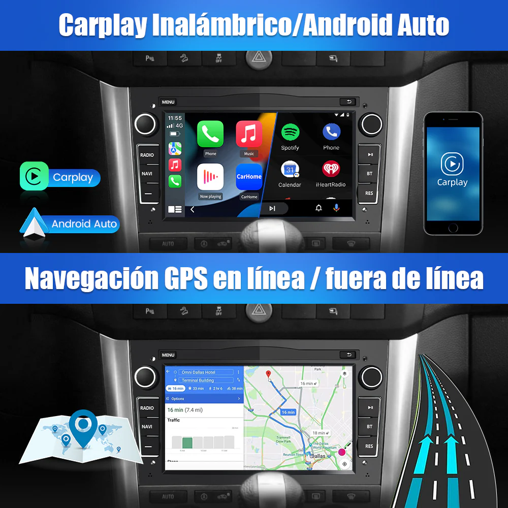 - 🚥【Carplay y Android Auto Incorporado】Carplay inalámbrico, no es necesario conectar el cable USB. Además, puede usar las funciones que tengan Android Auto en la radio de coche : Maps / Music /Llamadas. ¡También puede sincronizar los datos de las aplicaciones de su móvil: Maps(por ejemplo Google Maps), Spotify, iTunes, etc. y usarlos en línea!