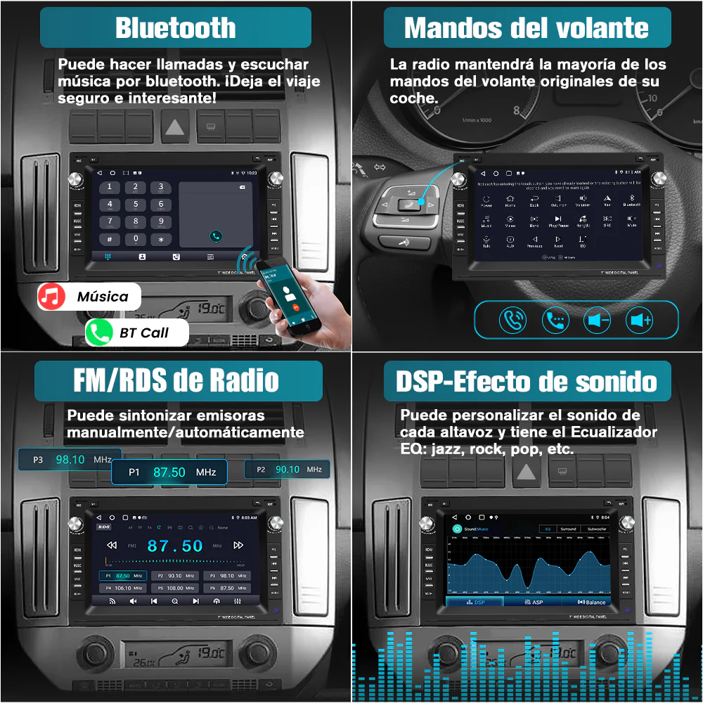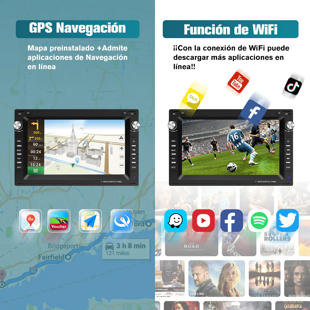 - 🚗【Disfruta de su viaje con reproductor de multimedia】1. Apoya la reproducción de multimedia por Bluetooth, USB,etc. 2. Puede sintonizar la radio por FM/RDS. 3. Tiene memoria de RAM 2GB y ROM 32 GB y admite WiFi, puede escuchar música o ver vídeo tanto en línea por Wifi como fuera de línea.