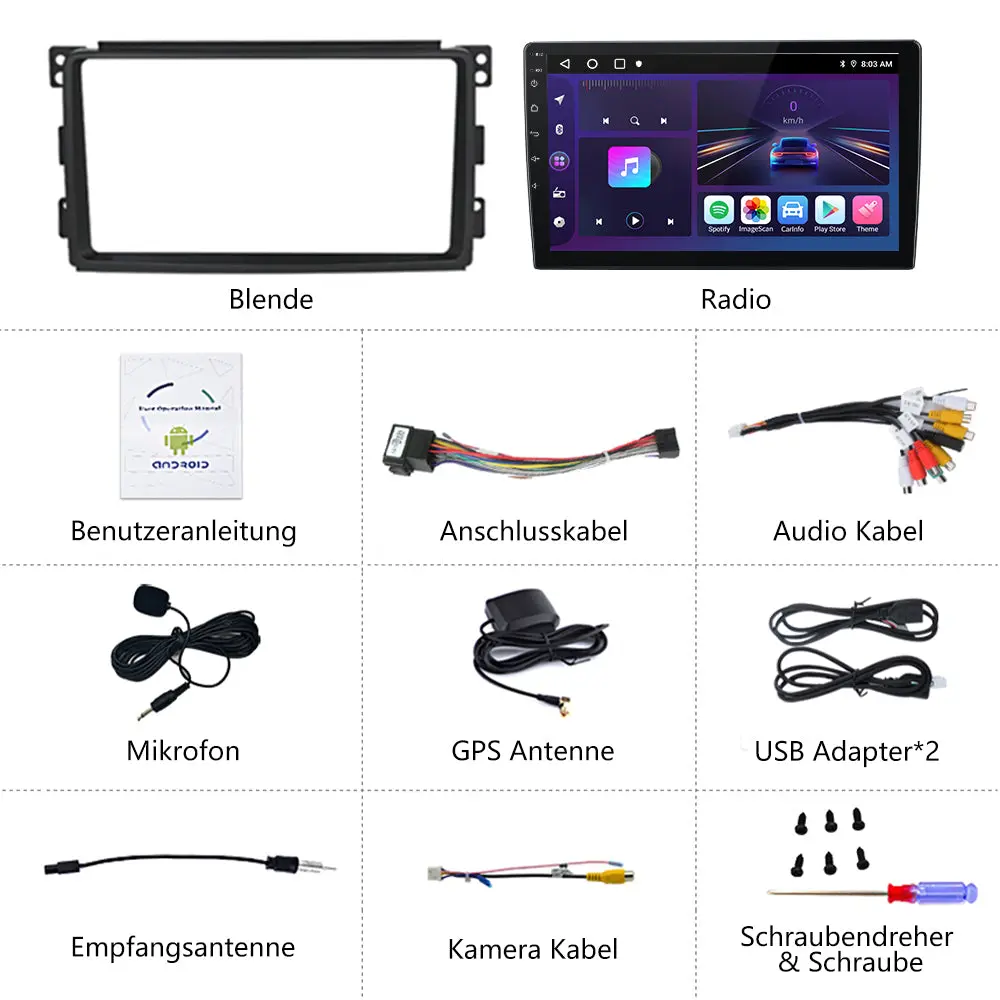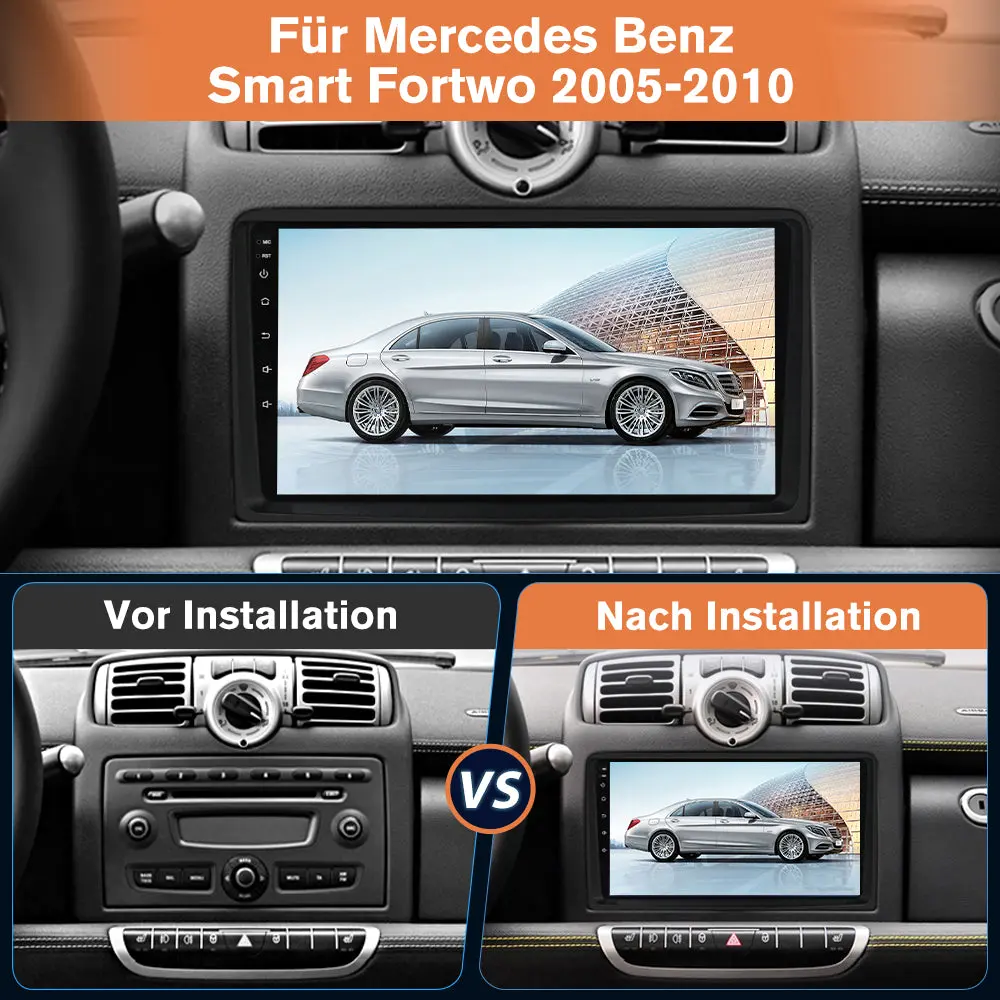 【Android Autoradio】mit Blende für Mercedes Benz Smart Fortwo Baujahr 2005-2010. Das Radio ist mit riesigem 9 Zoll Touchscreen und einem Android 13 Betriebssystem(2GB RAM + 32GB ROM) und WIFI-Empfänger ausgestattet. Sie können eine Verbindung zum Internet herstellen (z. B. über die Hotspot-Funktion Ihres Smartphones)