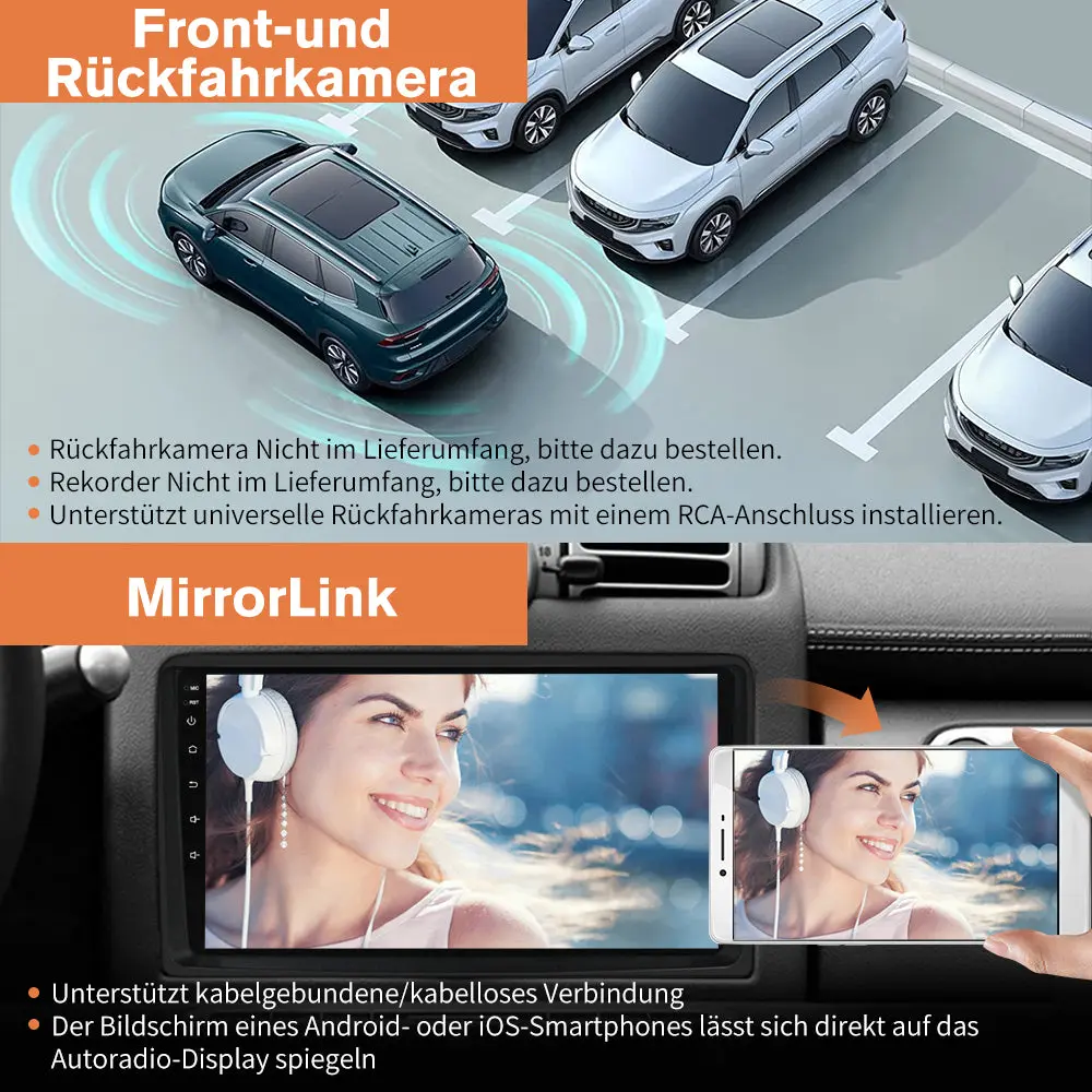 【Carplay und Android Auto】Unterstützt kabelgebundene/kabelloses Verbindung. Nachdem die Verbindung erfolgreich war, Sie können Funktionen wie Sprachassistenten und Online-Karten verwenden oder hören Sie Ihre Lieblingsmusik über Apps wie Spotify hören.