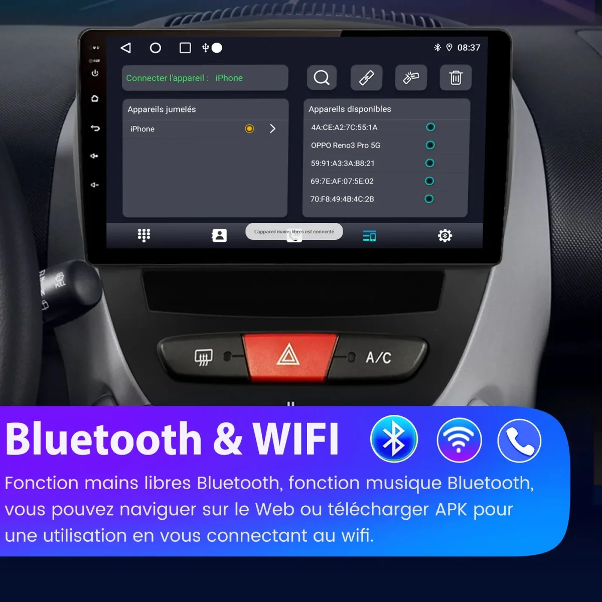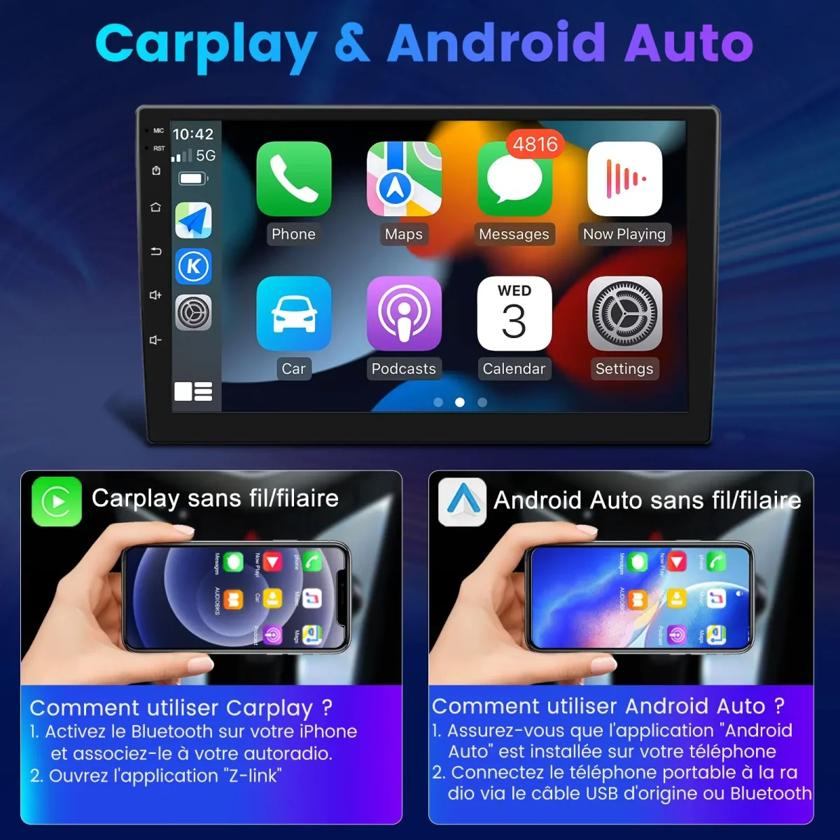 - 【Carplay et Android Auto】 L’autoradio prend en charge l’interaction avec les smartphones, Carplay filaire/sans fil, Android auto filaire/sans fil, Mirrorlink, Airplay, et l’autoradio permet aux utilisateurs de passer des appels et d’écouter de la musique. Profitez d’un accès instantané aux cartes, à la musique ou aux catalogues en ligne.