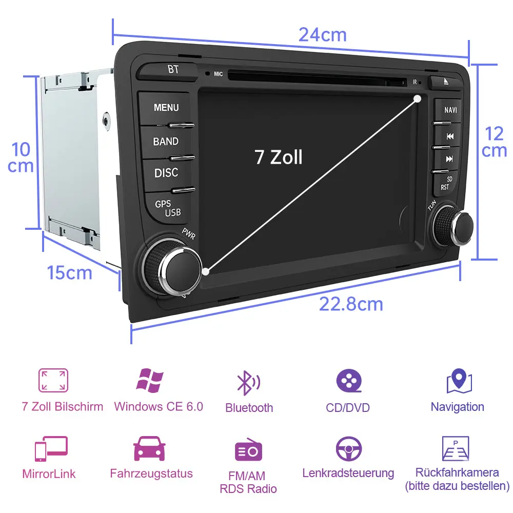 - 2-DIN Autoradio: Dieses Radio wurde speziell für Audi A3 S3 RS3 entwickelt und verfügt über ein CD-Laufwerk, das Windows CE-Betriebssystem und einen 7-Zoll-Touchscreen ca. 18 cm Bildschirm mit 800 x 480 Pixeln Auflösung. Sie können das Radio ganz einfach über den Touchscreen bedienen