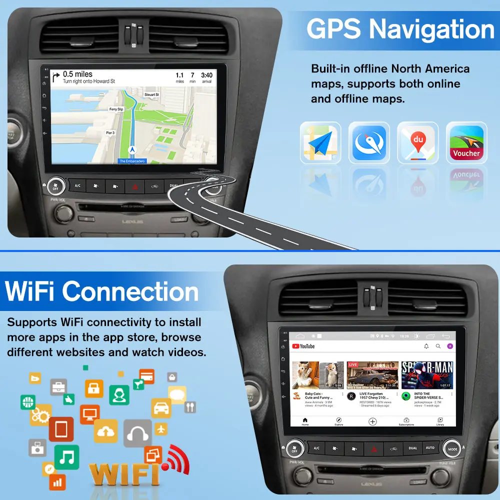 - 【GPS Navigation & WiFi Connection】For Lexus IS250 IS300 IS200 IS220 IS350, this supports online maps. After connecting to WiFi, you can use GPS Navigation anywhere. This Android radio allows you to install or delete Android apps from the Application Store, just like a smartphone