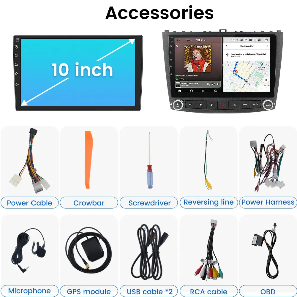 - 【Android System Upgrade】Android 13 system, 4-core processor, 2G RAM+32G ROM, 10-inch IPS touch screen, wireless carplay, wireless Android car, wired/wireless mirroring link, offline/online GPS navigation, WIFI connection, Bluetooth 5.1, FM radio, AHD backup camera, steering wheel control, split screen, 2 USBs, adjustable EQ, multi-format music player, 1080p video player, video and audio output, AUX audio and video input, multiple UI and wallpaper selections.