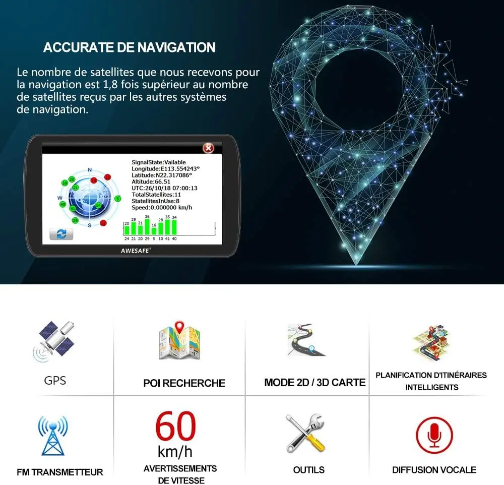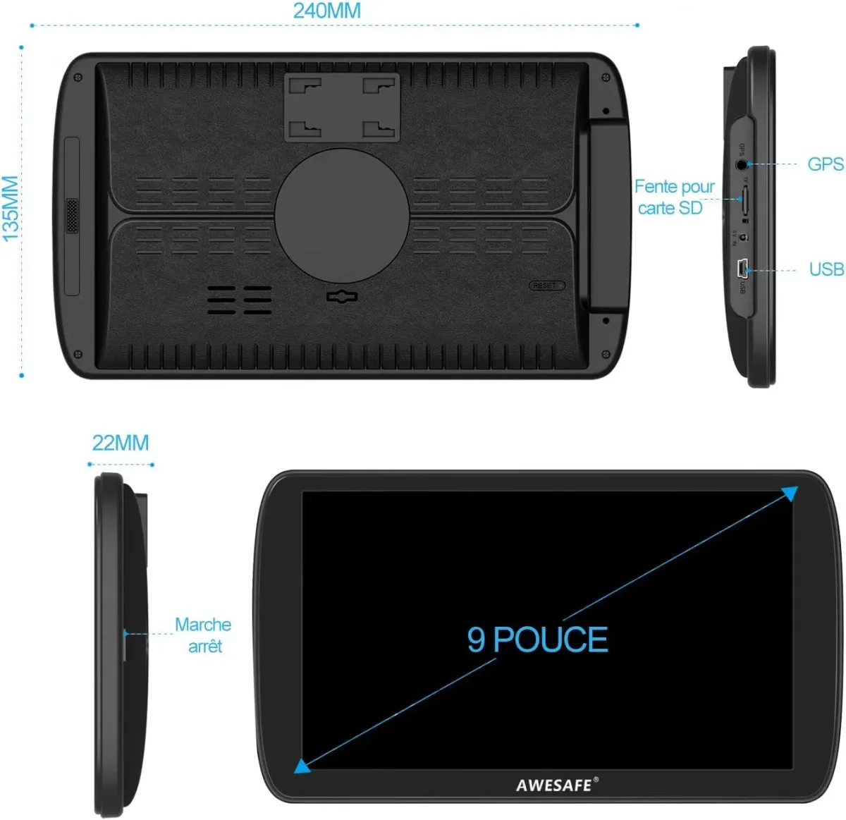 AWESAFE GPS Voiture Camion Écran Tactile 9 Pouces FM Bluetooth Cartes 2025 Mises à Jour Annuelles Gratuites