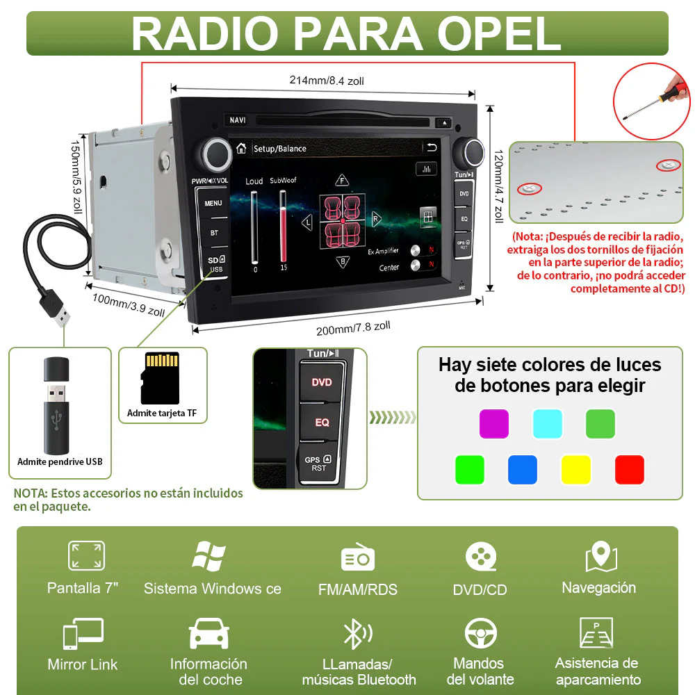 - 🚓【Necesaria radio Opel para su coche】 Marcas aplicables: Para Vivaro, para Antara, para Vectra, para Sigum, para Combo, para Zafira, para Astra, para Corsa, para Meriva. (Si no puede utilizar los mandos del volante para su coche, le enviaremos otro tipo de canbus.) Podría ver la imagen de los coches adecuados. El tamaño es: 214mm*120mm*200mm.