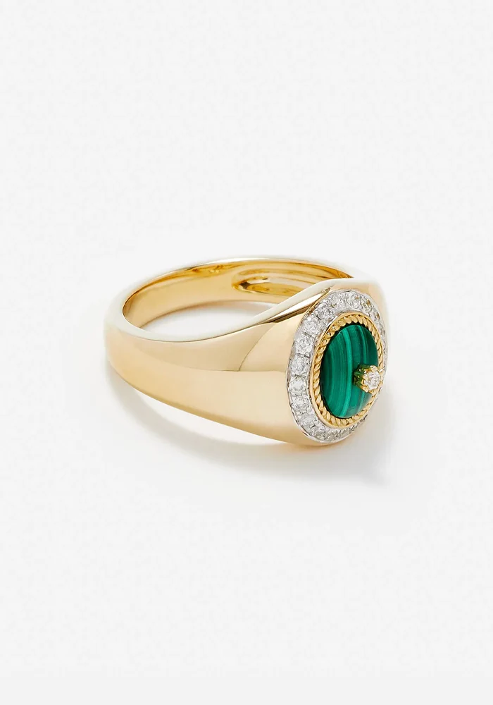 Bague Baby chevalière Pompadour en or jaune 9 carats avec une malachite cabochon ovale sertie de diamants gris.
