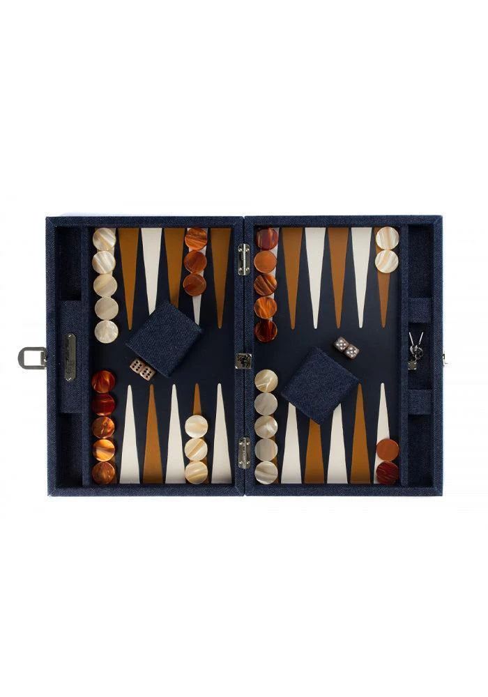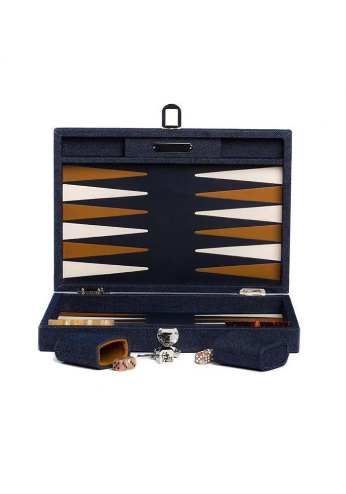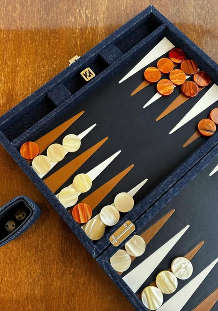Le Backgammon Daniel, moyen modèle, en toile jean bleu à l’extérieur et en cuir à l’intérieur.