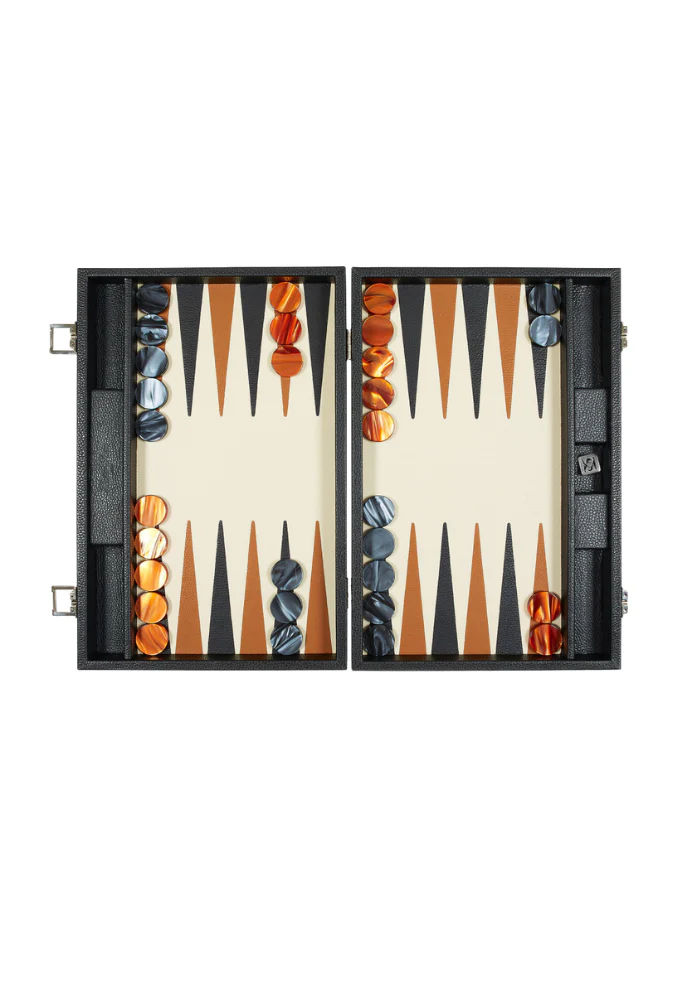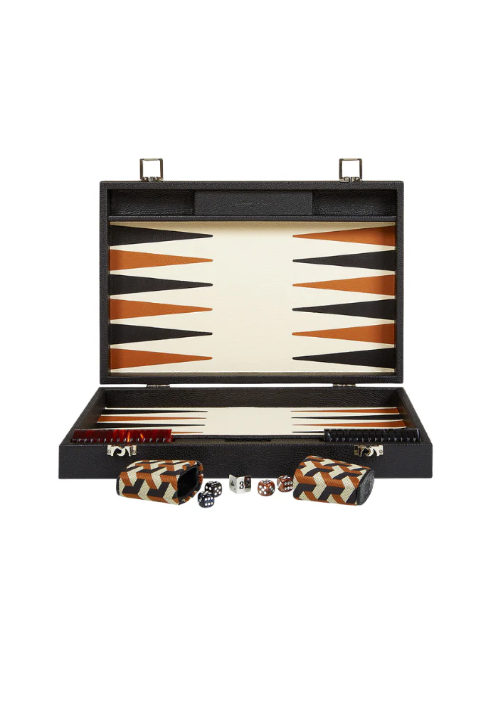- Contenance : 30 pions en acétate (31mm x 6mm), 4 dés en résine (16mm), 1 videau métal (20mm), 2 gobelets grainés en cuir