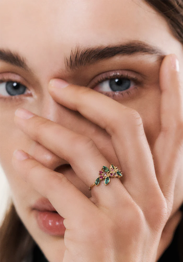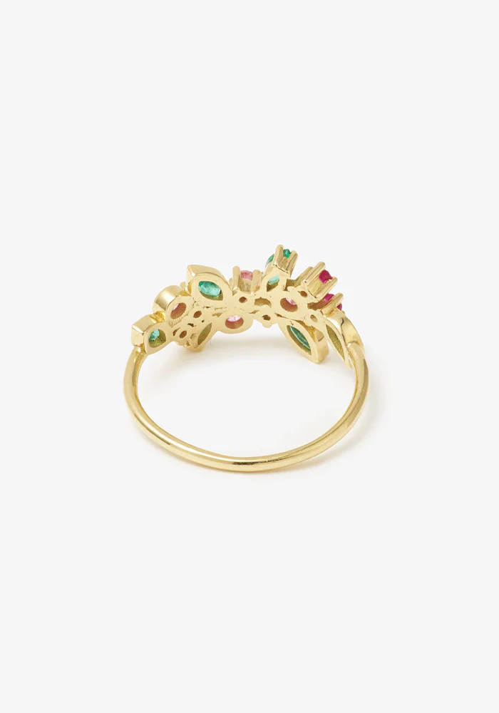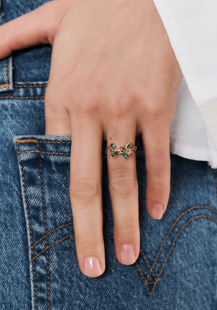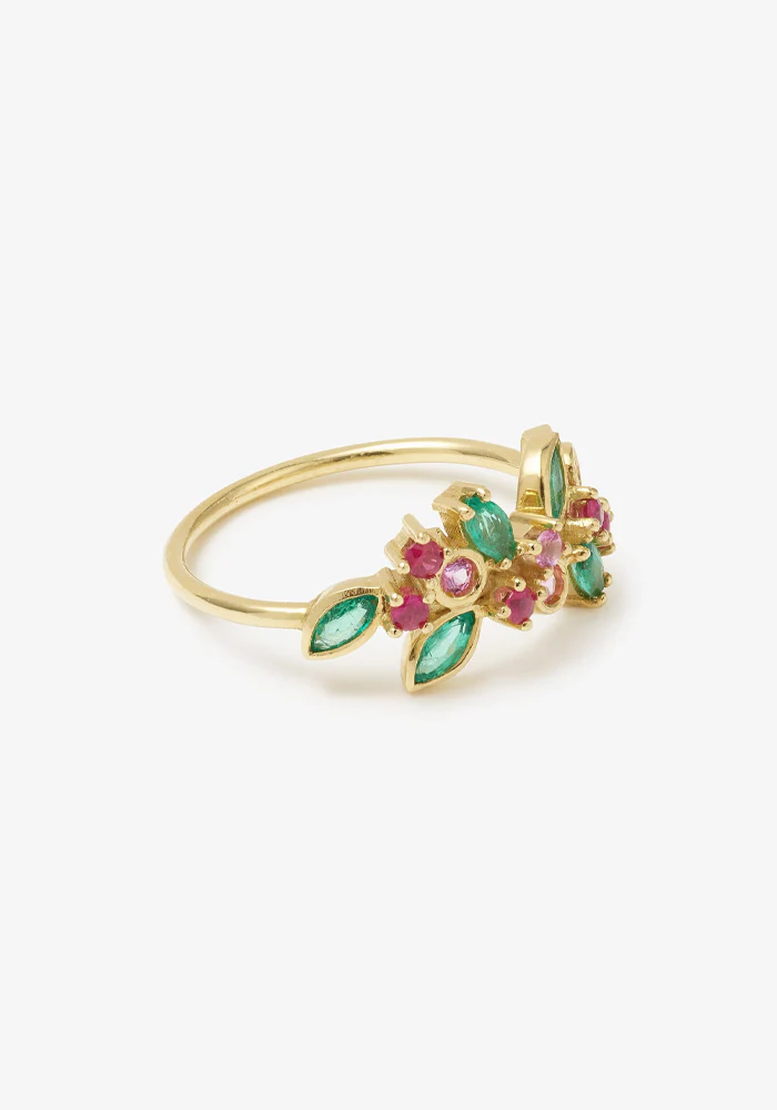 Bague Camélia 1 réalisée à la main en or jaune 18 carats et sertie de 15 pierres précieuses : 4 saphirs roses, 5 rubis et 6 émeraudes taille Marquise.
