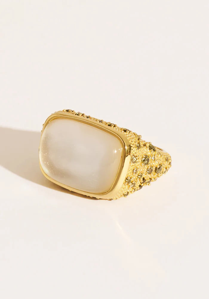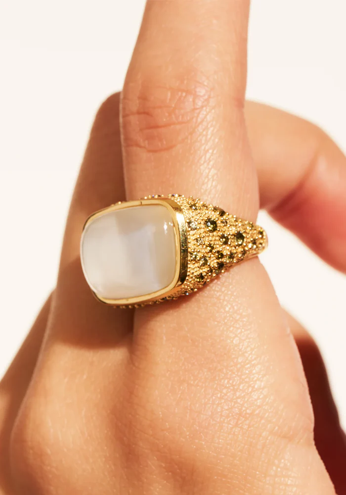 Bague Empreinte épaisse en plaqué or avec une nacre rectangulaire donc les bords sont arrondis et des zircons kaki.