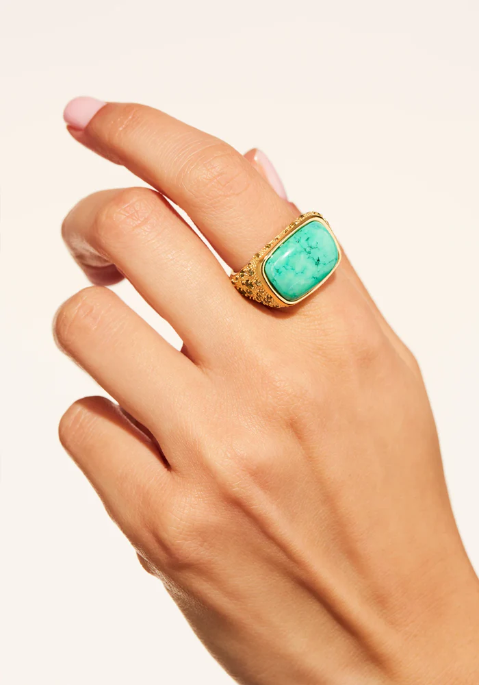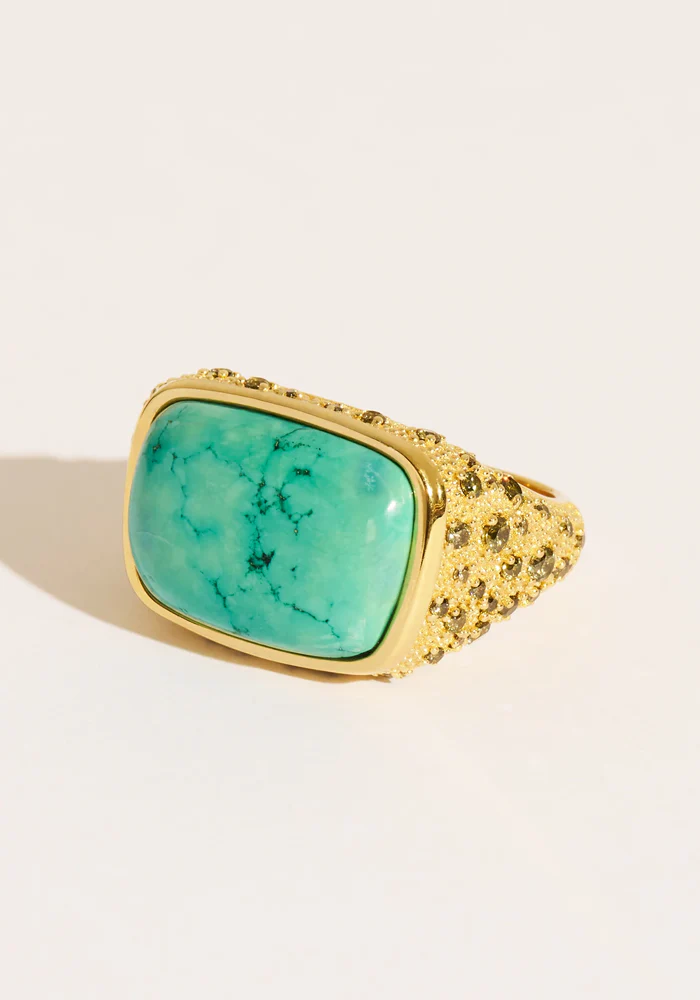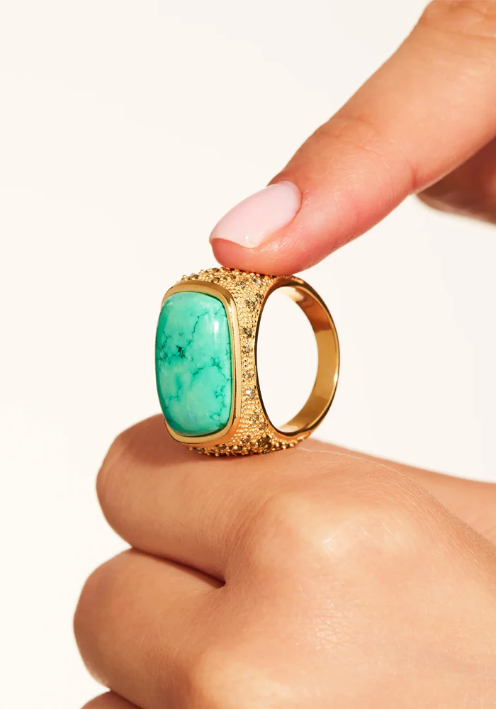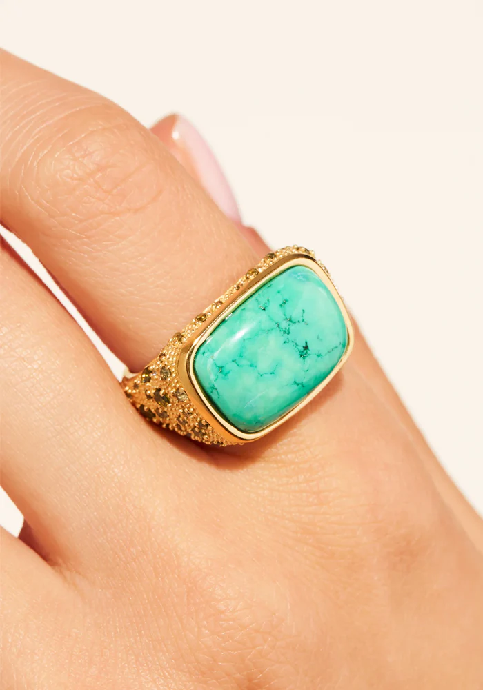 Bague Empreinte épaisse en plaqué or avec une turquoise rectangulaire donc les bords sont arrondis et des zircons kaki.