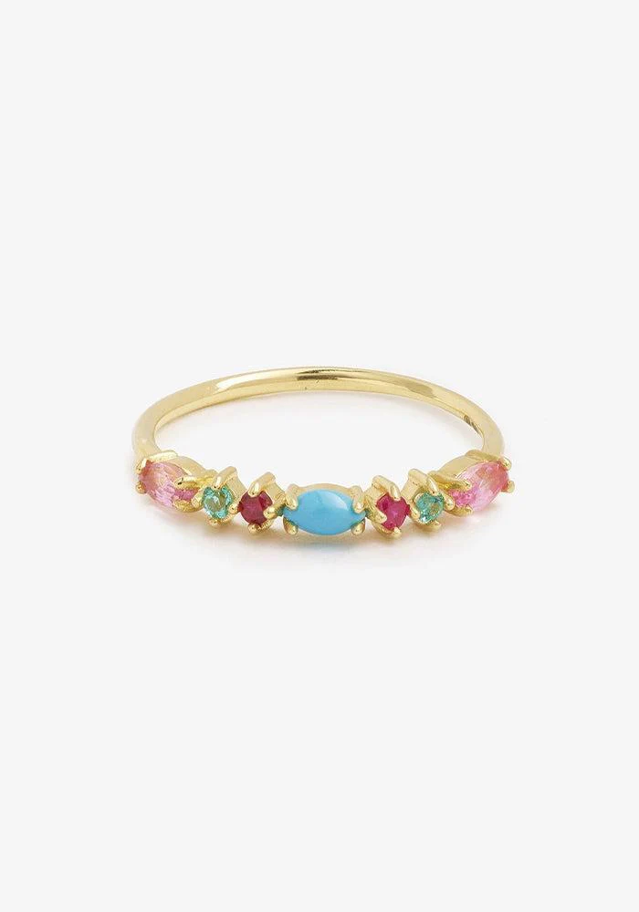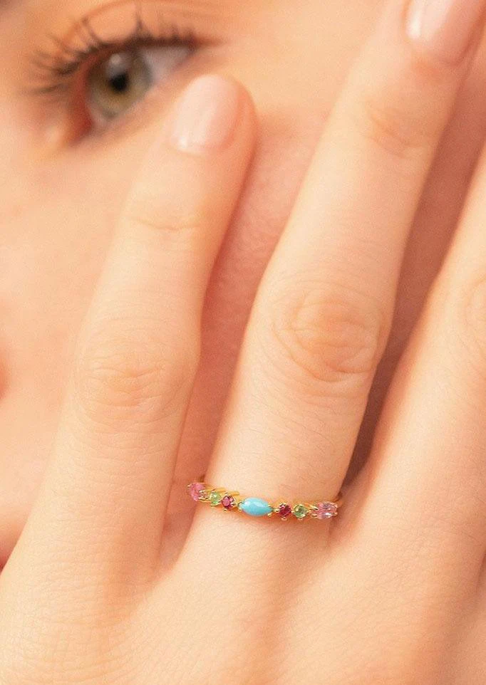 Bague Gaia 3 Turquoise est réalisée à la main en or jaune recyclé 18 carats et sertie de 7 pierres précieuses (alternant taille Brillant et taille Marquise) : 2 émeraudes, 2 saphirs roses taille Marquise, 2 rubis et 1 turquoise naturelle taille Marquise.