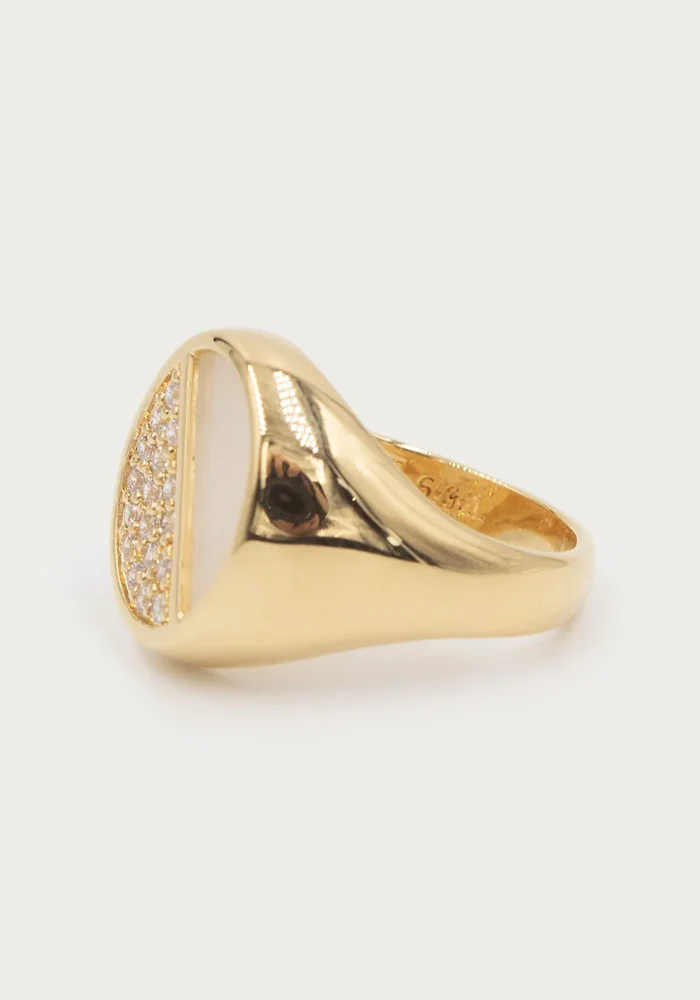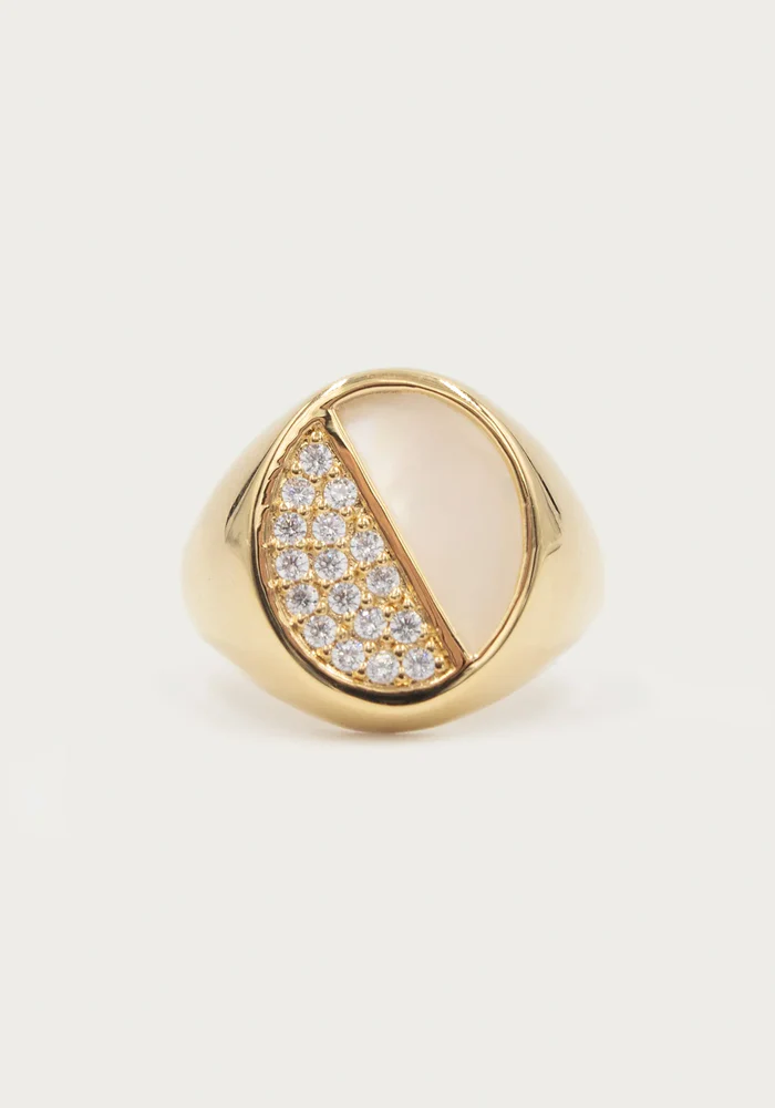 Bague Halo avec un ovale séparé en deux dont une partie est en nacre et l’autre est pavée de strass.