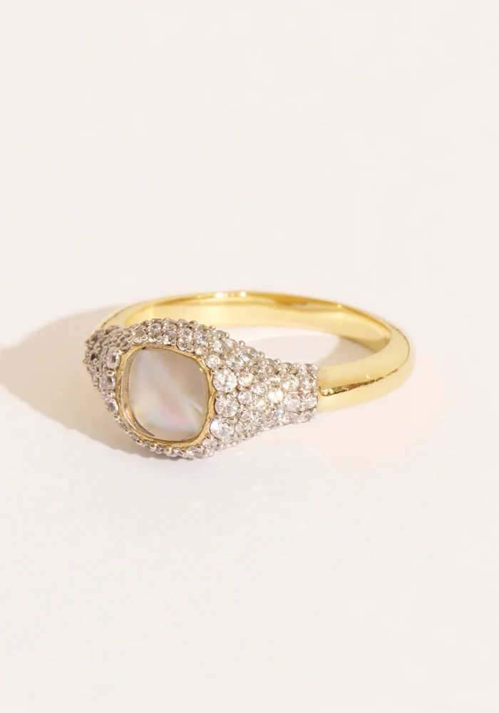 Bague Holy type chevalière en laiton doré à l’or fin 18 carats décorée d’une nacre carrés avec les bords arrondis et de zircons blancs.