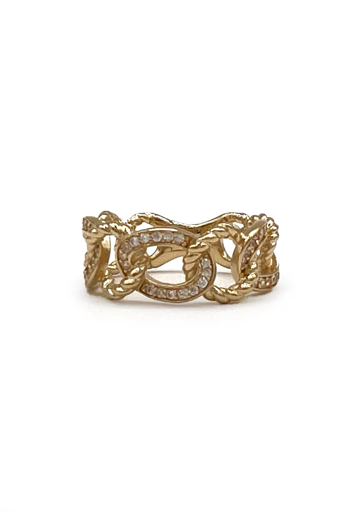 Bague Jessy en maillons de chaines qui alternent maillons striés et maillons pavés de zircons.