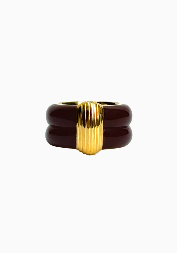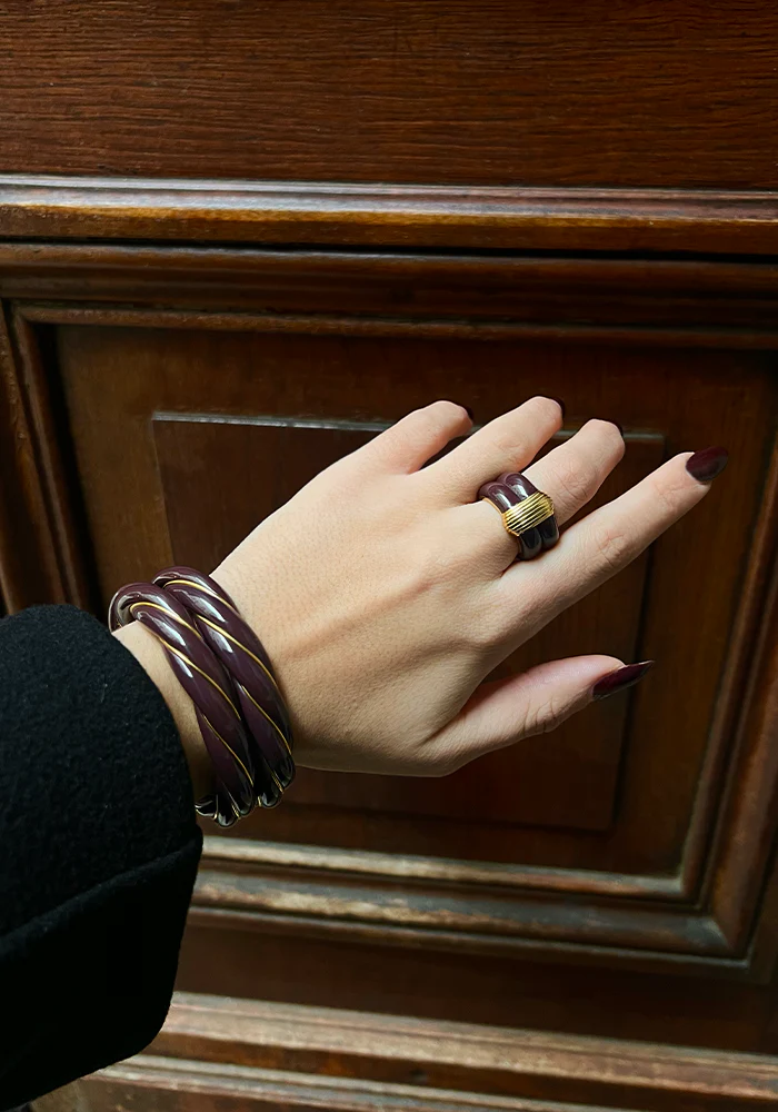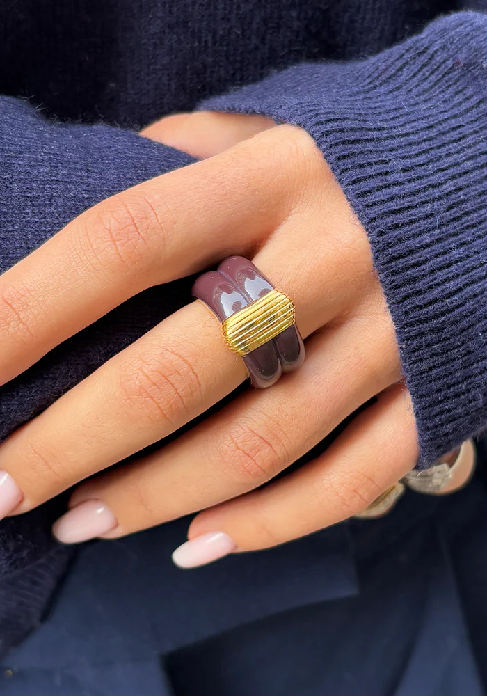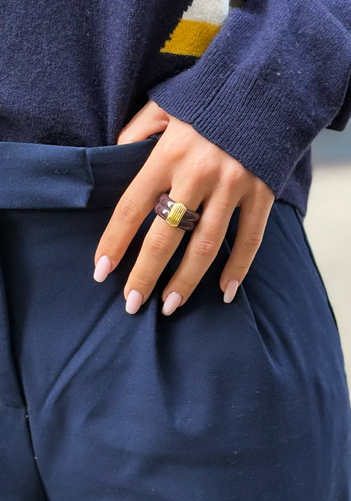 - Détail strié et intérieur de la bague dorés à l’or jaune