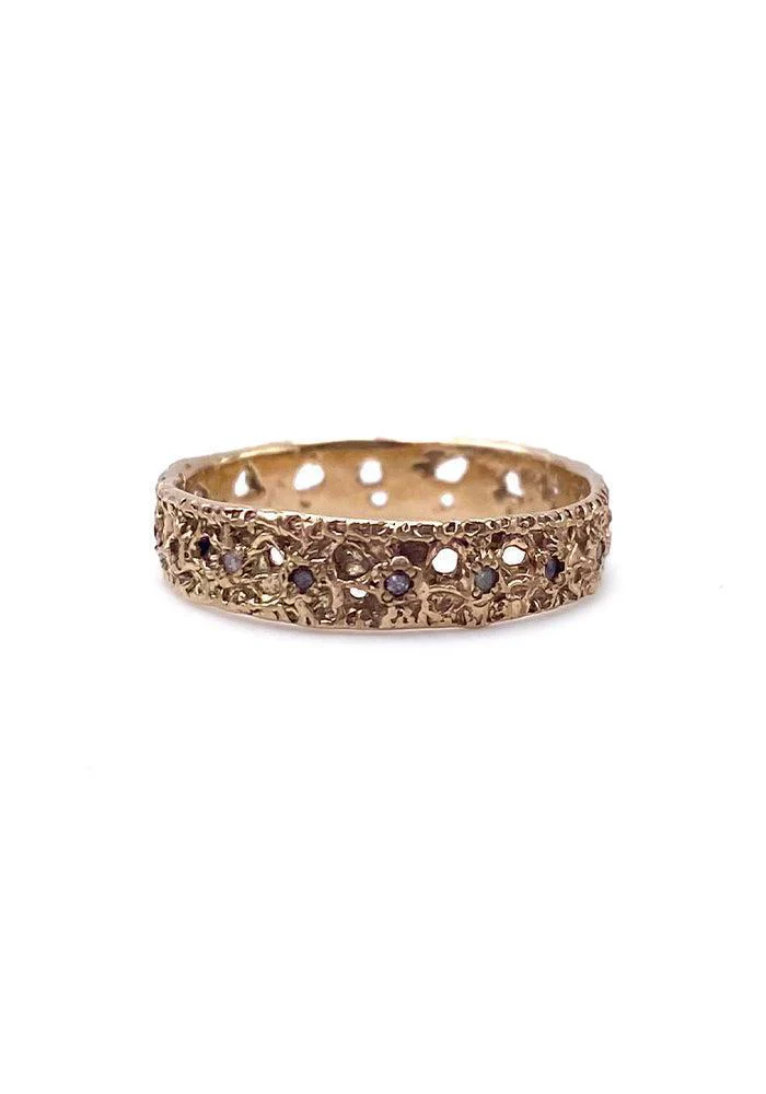 Bague effet dentelle en or jaune 10 carats avec des diamants blancs.