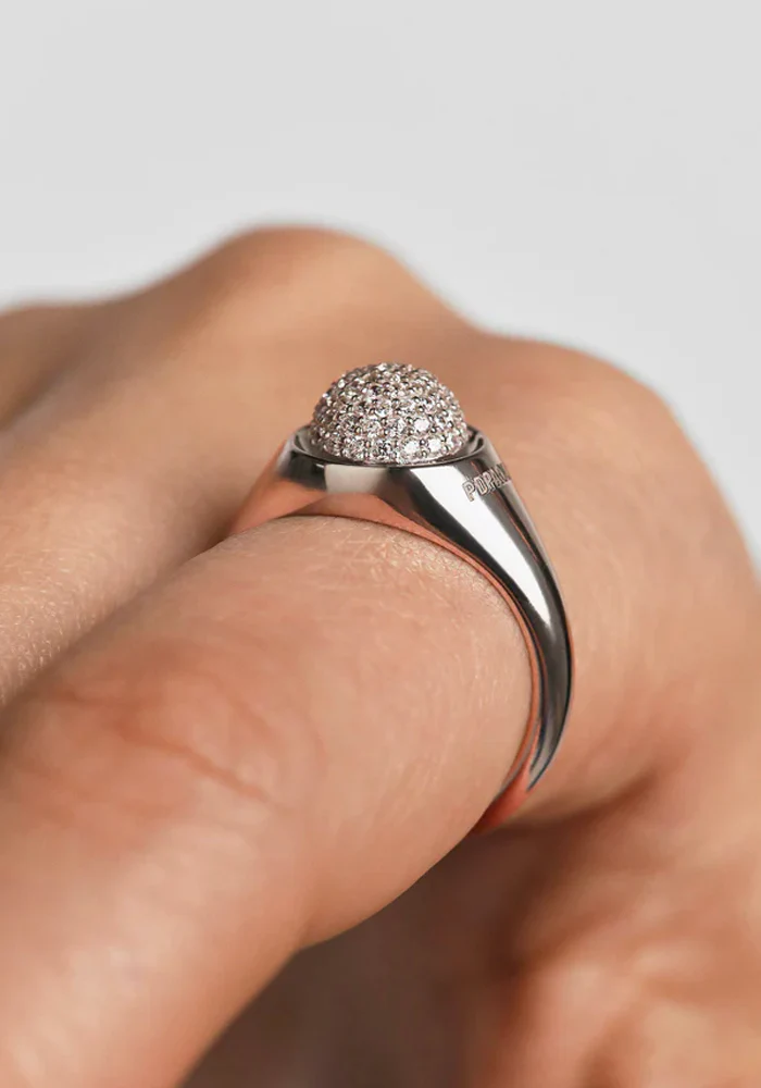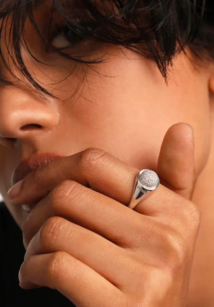Bague Moon en argent avec une sphère pavée de strass.