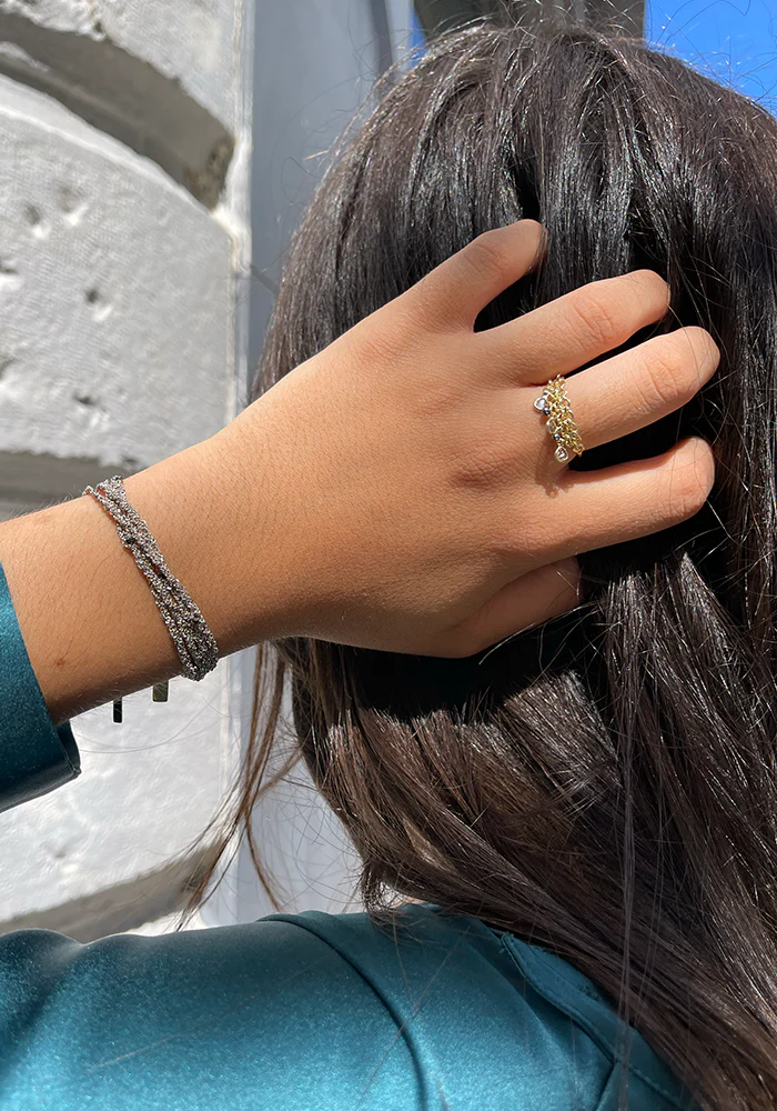 Bague en vermeil avec des chaines, deux boules en ruthénium et trois diamants polki.