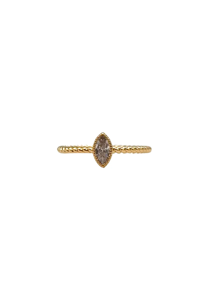 Anneau fin torsadé, orné d’un zircon ovale à facettes, serti et en plaqué or jaune.