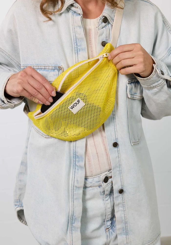 Banane Ray en tissu avec une finition en maille jaune avec des détails en tissu beige.