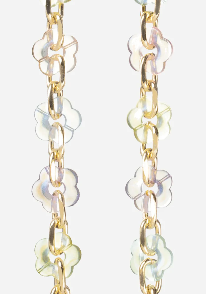 Bijou de téléphone Cassy Holographique avec des fleurs holographiques reliées par des anneaux dorés. Caractéristiques : Composition : Résine Longueur : 120 cm Maillons fleurs transparents Mousquetons dorés rotatifs en acier inoxydable