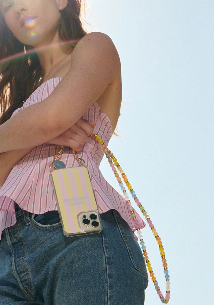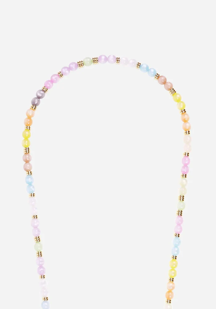 Bijou de téléphone Laly, orné de perles œil de chat multicolores aux tons pastel et de pampilles dorées.