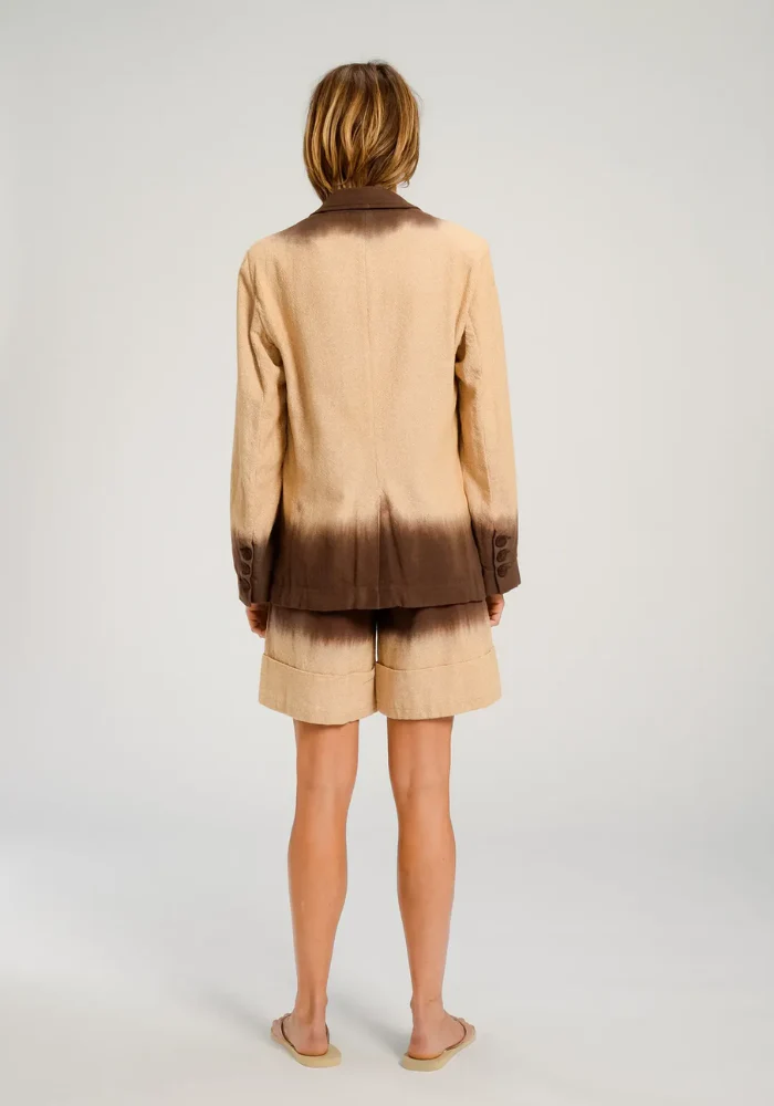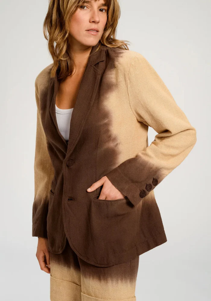 Caractéristiques : Composition : 100% coton Double tissage fil à fil Effet légèrement chiné Teinture tie & dye chocolat réalisée à la main Coupe inspiration tailoring Manches longues Poches sur le devant Coloris : Cacao Entretien : Lavage en machine max. 30°C cycle fragile Laver à l’envers