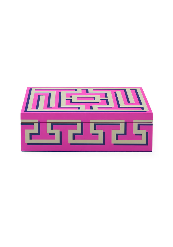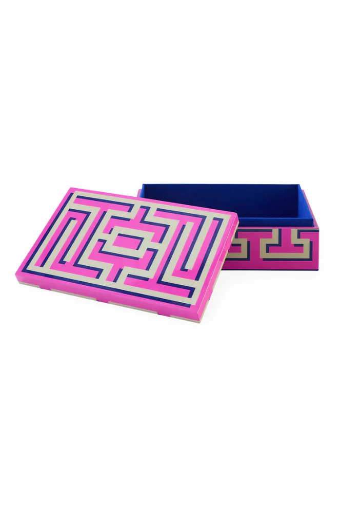 Caractéristiques : Matériaux : Laqué rose, bleu et blanche, intérieur en velours bleu marine Dimensions : 25 cm x 15.2 cm x 7.6 cm