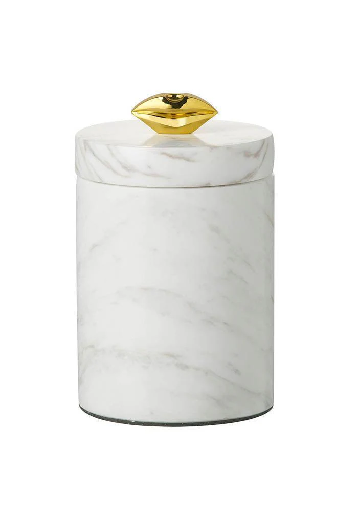 Pot avec couvercle Lippy style marbre blanc et doré Caractéristiques: Matière: Ciment et pierre Dimensions: 10 x 15cm Poids: 1,79kg