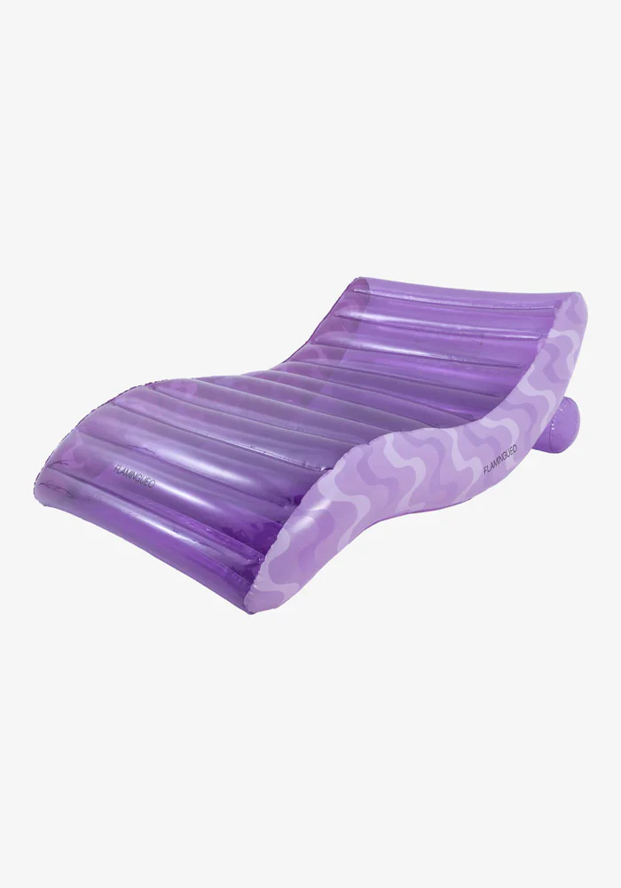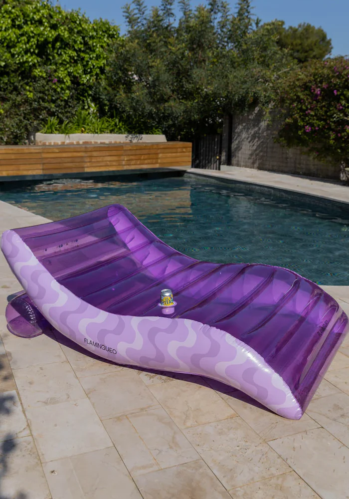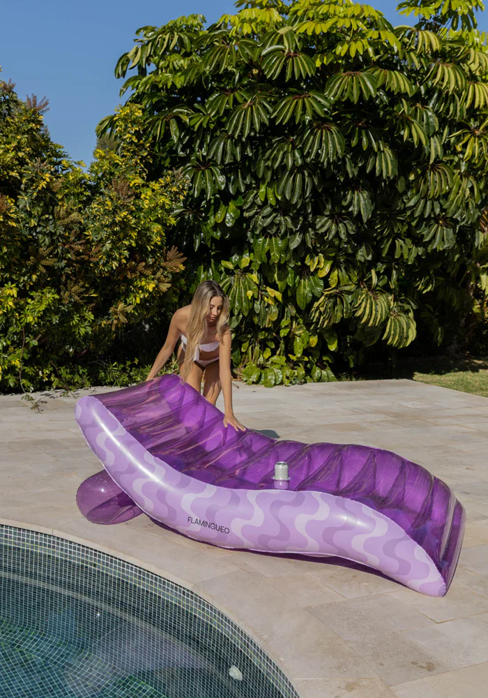 Bouée Arlo en forme de chaise longue violette. Très grande, elle est idéale pour se détendre.
