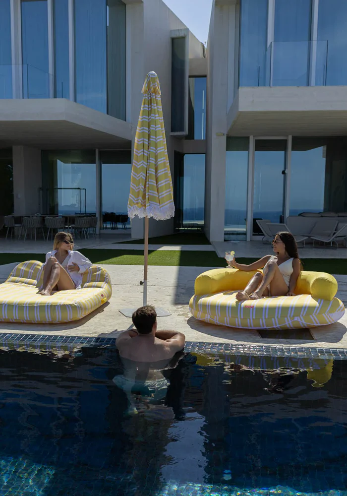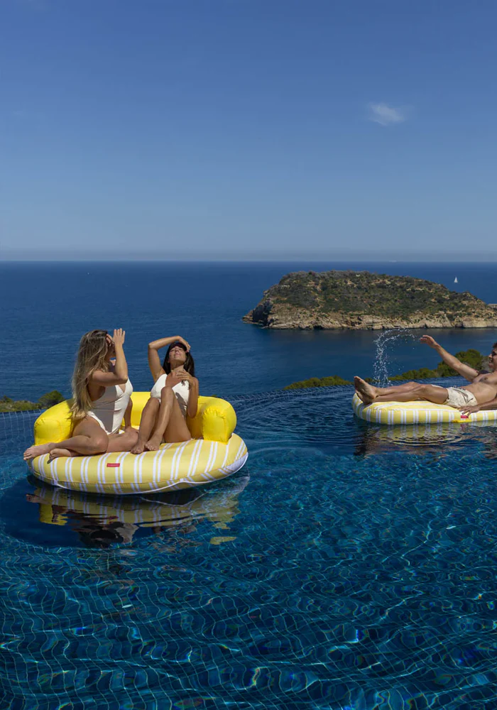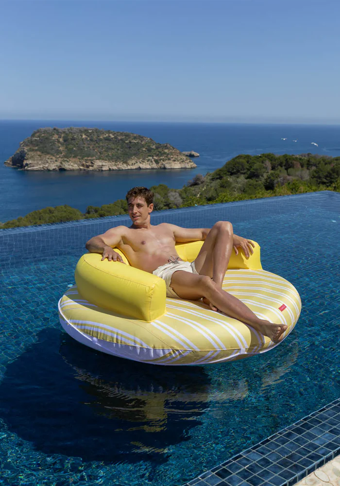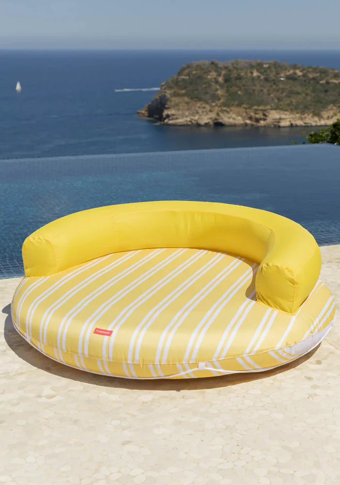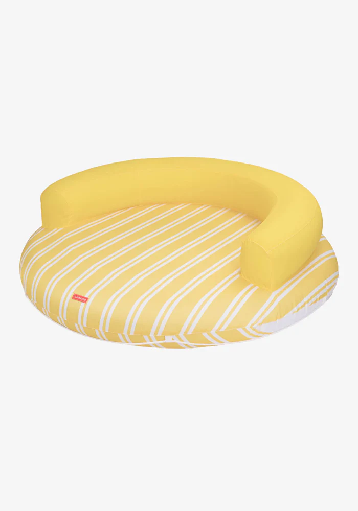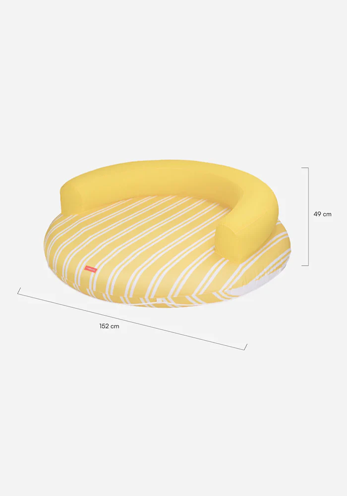 Bouée Atlanta jaune et ronde avec un dossier. Caractéristiques : Structure intérieure en PVC Housse extérieure 100 % polyester Capacité pour 2 personnes Grille de drainage inférieure Corde de saisie Poids maximum : 180 kg Dimensions : 152 x 152 x 49 cm
