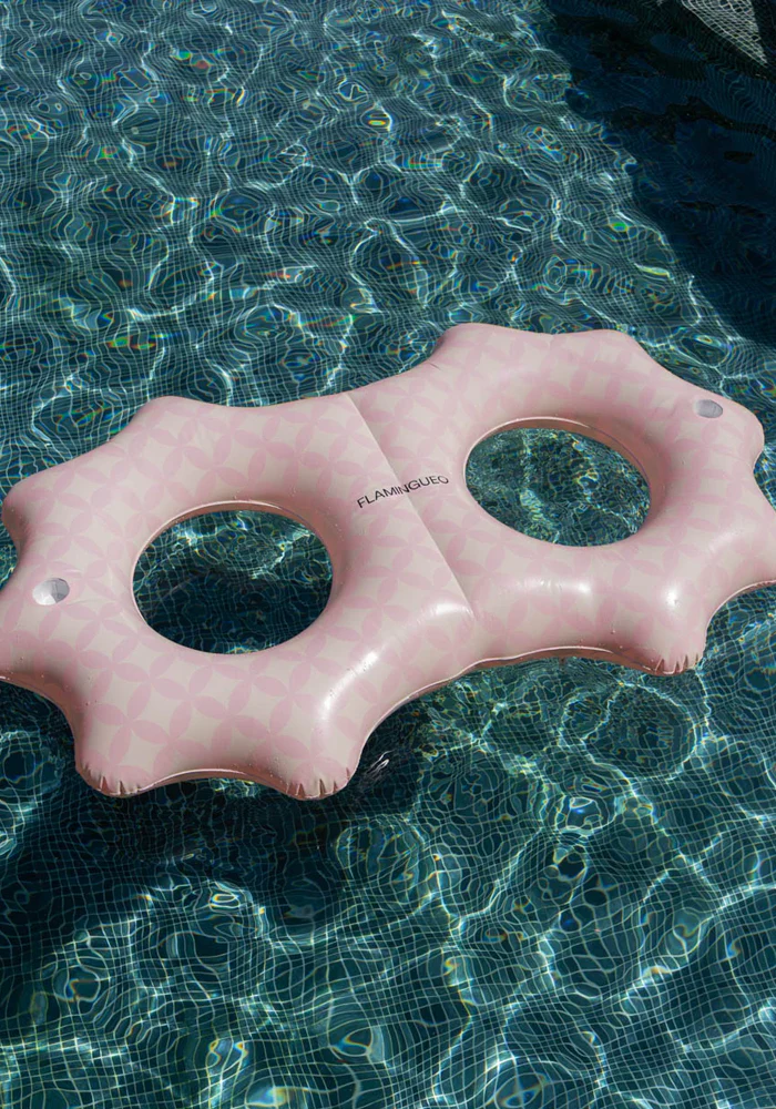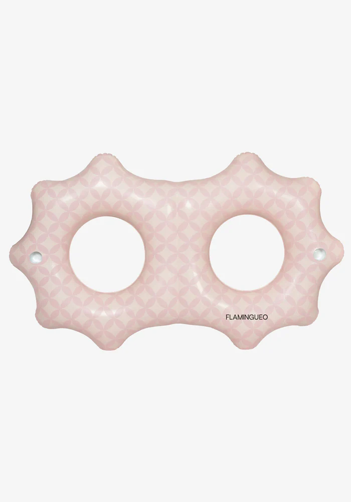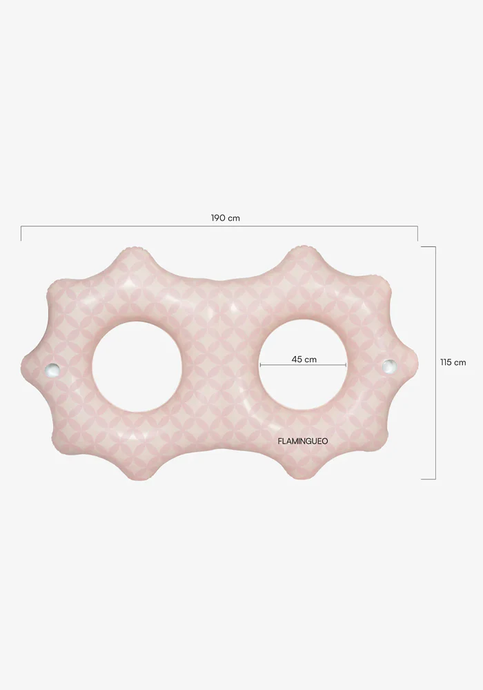 Bouée Ciao double avec des motifs rose. Caractéristiques : Flotteur double donut PVC 0,28 mm avec paillettes Double valve 2 sous-verres Finition ondulée Poids maximum : 150 kg Diamètre intérieur 45 cm Dimensions : 190 x 115 x 42 cm