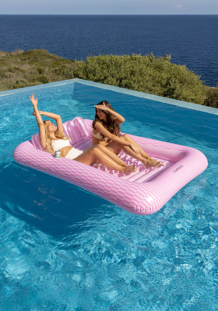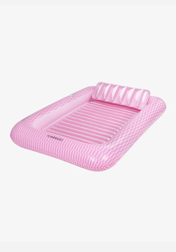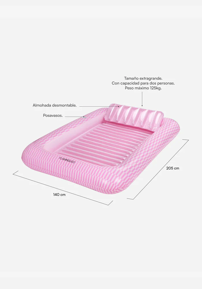 Bouée Portofino ou piscine de bronzage rose. Elle peut être remplie d’eau. Caractéristiques : Piscine de bronzage PVC 0,28 mm Double valve Oreiller amovible Taille extra large (2 personnes) Il peut être rempli d’eau comme une petite piscine. Dessous de verre Poids maximum : 125 kg Dimensions : 140 x 205 x 38 cm