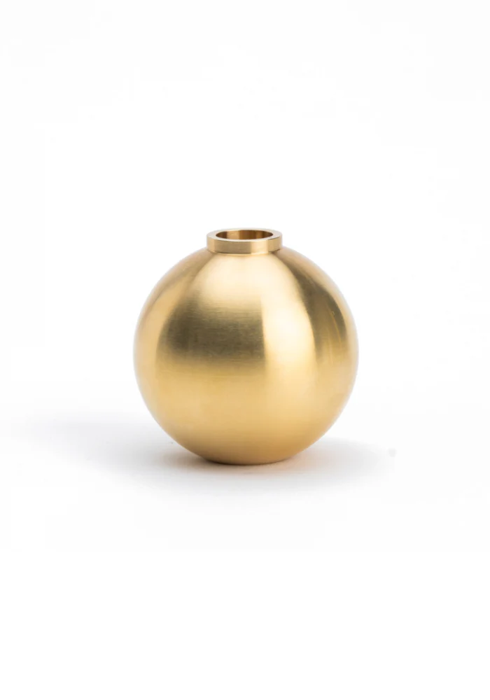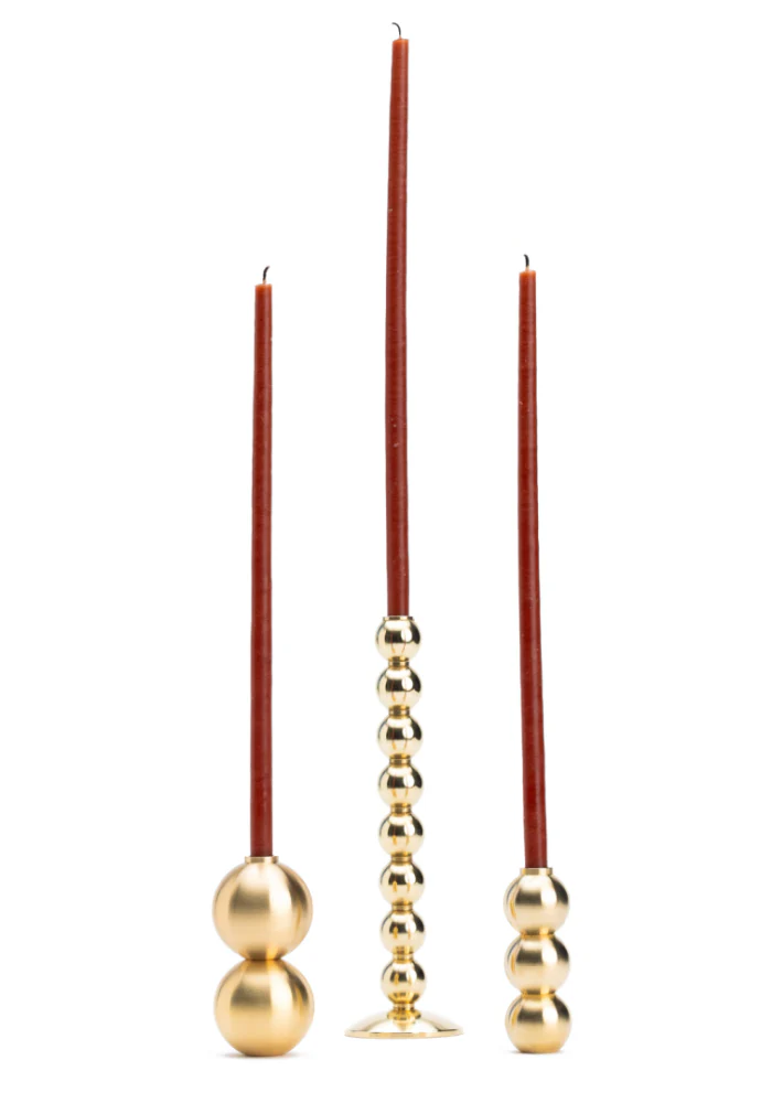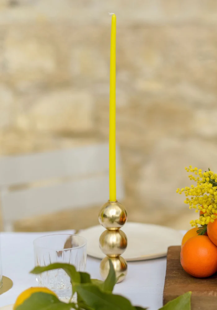 Bougeoir sphère en laiton massif pour bougies fines. Caractéristiques : Sphère de diamètre 48mm Peut être superposé Convient aux bougies fines de diamètre 0.8cm à 1cm. (divers assortiments de couleurs disponibles) Fabriqué en France